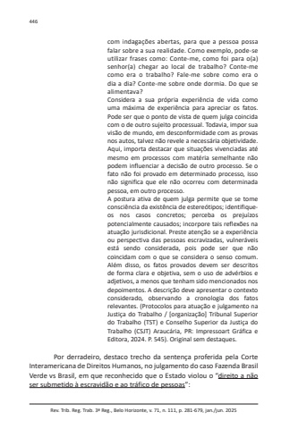 Rev. Trib. Reg. Trab. 3ª Reg., Belo Horizonte, v. 71, n. 111, p. 281-679, jan./jun. 2025446com indagações abertas, para que a pessoa possa falar sobre a sua realidade. Como exemplo, pode-se utilizar frases como: Conte-me, como foi para o(a) senhor(a) chegar ao local de trabalho? Conte-me como era o trabalho? Fale-me sobre como era o dia a dia? Conte-me sobre onde dormia. Do que se alimentava?Considera a sua própria experiência de vida como uma máxima de experiência para apreciar os fatos. Pode ser que o ponto de vista de quem julga coincida com o de outro sujeito processual. Todavia, impor sua visão de mundo, em desconformidade com as provas nos autos, talvez não revele a necessária objetividade. Aqui, importa destacar que situações vivenciadas até mesmo em processos com matéria semelhante não podem influenciar a decisão de outro processo. Se o fato não foi provado em determinado processo, isso não significa que ele não ocorreu com determinada pessoa, em outro processo.A postura ativa de quem julga permite que se tome consciência da existência de estereótipos; identifiqueos nos casos concretos; perceba os prejuízos potencialmente causados; incorpore tais reflexões na atuação jurisdicional. Preste atenção se a experiência ou perspectiva das pessoas escravizadas, vulneráveis está sendo considerada, pois pode ser que não coincidam com o que se considera o senso comum. Além disso, os fatos provados devem ser descritos de forma clara e objetiva, sem o uso de advérbios e adjetivos, a menos que tenham sido mencionados nos depoimentos. A descrição deve apresentar o contexto considerado, observando a cronologia dos fatos relevantes. (Protocolos para atuação e julgamento na Justiça do Trabalho / [organização] Tribunal Superior do Trabalho (TST) e Conselho Superior da Justiça do Trabalho (CSJT) Araucária, PR: Impressoart Gráfica e Editora, 2024. P. 545). Original sem destaques.Por derradeiro, destaco trecho da sentença proferida pela Corte Interamericana de Direitos Humanos, no julgamento do caso Fazenda Brasil Verde vs Brasil, em que reconhecido que o Estado violou o “direito a não ser submetido à escravidão e ao tráfico de pessoas”: