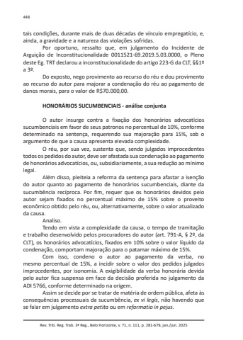 Rev. Trib. Reg. Trab. 3ª Reg., Belo Horizonte, v. 71, n. 111, p. 281-679, jan./jun. 2025448tais condições, durante mais de duas décadas de vínculo empregatício, e, ainda, a gravidade e a natureza das violações sofridas.Por oportuno, ressalto que, em julgamento do Incidente de Arguição de Inconstitucionalidade 0011521-69.2019.5.03.0000, o Pleno deste Eg. TRT declarou a inconstitucionalidade do artigo 223-G da CLT, §§1º a 3º.Do exposto, nego provimento ao recurso do réu e dou provimento ao recurso do autor para majorar a condenação do réu ao pagamento de danos morais, para o valor de R$70.000,00.HONORÁRIOS SUCUMBENCIAIS - análise conjuntaO autor insurge contra a fixação dos honorários advocatícios sucumbenciais em favor de seus patronos no percentual de 10%, conforme determinado na sentença, requerendo sua majoração para 15%, sob o argumento de que a causa apresenta elevada complexidade.O réu, por sua vez, sustenta que, sendo julgados improcedentes todos os pedidos do autor, deve ser afastada sua condenação ao pagamento de honorários advocatícios, ou, subsidiariamente, a sua redução ao mínimo legal.Além disso, pleiteia a reforma da sentença para afastar a isenção do autor quanto ao pagamento de honorários sucumbenciais, diante da sucumbência recíproca. Por fim, requer que os honorários devidos pelo autor sejam fixados no percentual máximo de 15% sobre o proveito econômico obtido pelo réu, ou, alternativamente, sobre o valor atualizado da causa.Analiso.Tendo em vista a complexidade da causa, o tempo de tramitação e trabalho desenvolvido pelos procuradores do autor (art. 791-A, § 2º, da CLT), os honorários advocatícios, fixados em 10% sobre o valor líquido da condenação, comportam majoração para o patamar máximo de 15%.Com isso, condeno o autor ao pagamento da verba, no mesmo percentual de 15%, a incidir sobre o valor dos pedidos julgados improcedentes, por isonomia. A exigibilidade da verba honorária devida pelo autor fica suspensa em face da decisão proferida no julgamento da ADI 5766, conforme determinado na origem.Assim se decide por se tratar de matéria de ordem pública, afeta às consequências processuais da sucumbência, ex vi legis, não havendo que se falar em julgamento extra petita ou em reformatio in pejus.
