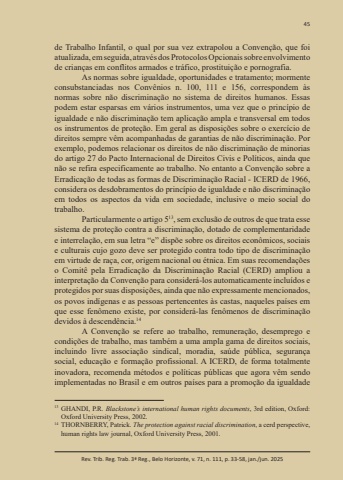 45Rev. Trib. Reg. Trab. 3ª Reg., Belo Horizonte, v. 71, n. 111, p. 33-58, jan./jun. 2025de Trabalho Infantil, o qual por sua vez extrapolou a Convenção, que foi atualizada, em seguida, através dos Protocolos Opcionais sobre envolvimento de crianças em conflitos armados e tráfico, prostituição e pornografia.As normas sobre igualdade, oportunidades e tratamento; mormente consubstanciadas nos Convênios n. 100, 111 e 156, correspondem às normas sobre não discriminação no sistema de direitos humanos. Essas podem estar esparsas em vários instrumentos, uma vez que o princípio de igualdade e não discriminação tem aplicação ampla e transversal em todos os instrumentos de proteção. Em geral as disposições sobre o exercício de direitos sempre vêm acompanhadas de garantias de não discriminação. Por exemplo, podemos relacionar os direitos de não discriminação de minorias do artigo 27 do Pacto Internacional de Direitos Civis e Políticos, ainda que não se refira especificamente ao trabalho. No entanto a Convenção sobre a Erradicação de todas as formas de Discriminação Racial - ICERD de 1966, considera os desdobramentos do princípio de igualdade e não discriminação em todos os aspectos da vida em sociedade, inclusive o meio social do trabalho.Particularmente o artigo 513, sem exclusão de outros de que trata esse sistema de proteção contra a discriminação, dotado de complementaridade e interrelação, em sua letra “e” dispõe sobre os direitos econômicos, sociais e culturais cujo gozo deve ser protegido contra todo tipo de discriminação em virtude de raça, cor, origem nacional ou étnica. Em suas recomendações o Comitê pela Erradicação da Discriminação Racial (CERD) ampliou a interpretação da Convenção para considerá-los automaticamente incluídos e protegidos por suas disposições, ainda que não expressamente mencionados, os povos indígenas e as pessoas pertencentes às castas, naqueles países em que esse fenômeno existe, por considerá-las fenômenos de discriminação devidos à descendência.14A Convenção se refere ao trabalho, remuneração, desemprego e condições de trabalho, mas também a uma ampla gama de direitos sociais, incluindo livre associação sindical, moradia, saúde pública, segurança social, educação e formação profissional. A ICERD, de forma totalmente inovadora, recomenda métodos e políticas públicas que agora vêm sendo implementadas no Brasil e em outros países para a promoção da igualdade 13 GHANDI, P.R. Blackstone’s international human rights documents, 3rd edition, Oxford: Oxford University Press, 2002. 14 THORNBERRY, Patrick. The protection against racial discrimination, a cerd perspective, human rights law journal, Oxford University Press, 2001.