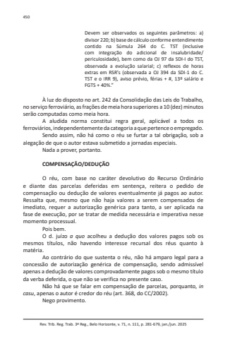 Rev. Trib. Reg. Trab. 3ª Reg., Belo Horizonte, v. 71, n. 111, p. 281-679, jan./jun. 2025450Devem ser observados os seguintes parâmetros: a) divisor 220; b) base de cálculo conforme entendimento contido na Súmula 264 do C. TST (inclusive com integração do adicional de insalubridade/periculosidade), bem como da OJ 97 da SDI-I do TST, observada a evolução salarial; c) reflexos de horas extras em RSR’s (observada a OJ 394 da SDI-1 do C. TST e o IRR 9), aviso prévio, férias + #, 13º salário e FGTS + 40%.”À luz do disposto no art. 242 da Consolidação das Leis do Trabalho, no serviço ferroviário, as frações de meia hora superiores a 10 (dez) minutos serão computadas como meia hora.A aludida norma constitui regra geral, aplicável a todos os ferroviários, independentemente da categoria a que pertence o empregado.Sendo assim, não há como o réu se furtar a tal obrigação, sob a alegação de que o autor estava submetido a jornadas especiais.Nada a prover, portanto.COMPENSAÇÃO/DEDUÇÃOO réu, com base no caráter devolutivo do Recurso Ordinário e diante das parcelas deferidas em sentença, reitera o pedido de compensação ou dedução de valores eventualmente já pagos ao autor. Ressalta que, mesmo que não haja valores a serem compensados de imediato, requer a autorização genérica para tanto, a ser aplicada na fase de execução, por se tratar de medida necessária e imperativa nesse momento processual.Pois bem.O d. juízo a quo acolheu a dedução dos valores pagos sob os mesmos títulos, não havendo interesse recursal dos réus quanto à matéria.Ao contrário do que sustenta o réu, não há amparo legal para a concessão de autorização genérica de compensação, sendo admissível apenas a dedução de valores comprovadamente pagos sob o mesmo título da verba deferida, o que não se verifica no presente caso.Não há que se falar em compensação de parcelas, porquanto, in casu, apenas o autor é credor do réu (art. 368, do CC/2002).Nego provimento.