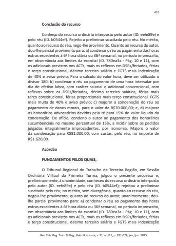 Rev. Trib. Reg. Trab. 3ª Reg., Belo Horizonte, v. 71, n. 111, p. 281-679, jan./jun. 2025451Conclusão do recursoConheço do recurso ordinário interposto pelo autor (ID. eefe89e) e pelo réu (ID. b0544ef). Rejeito a preliminar suscitada pelo réu. No mérito, quanto ao recurso do réu, nego-lhe provimento. Quanto ao recurso do autor, dou-lhe parcial provimento para: a) condenar o réu ao pagamento das horas extras excedentes à 6ª hora diária ou 36ª semanal, no período imprescrito, em observância aos limites da exordial (ID. 780ea3a - Pág. 10 e 11), com os adicionais previstos nos ACTs, mais os reflexos em DSRs/feriados, férias e terço constitucional, décimo terceiro salário e FGTS mais indenização de 40% e aviso prévio; Para o cálculo do valor hora, deve ser utilizado o divisor 180; b) condenar o réu ao pagamento de uma hora intervalar por dia de efetivo labor, com caráter salarial e adicional convencional, com reflexos sobre os DSRs/feriados, décimo terceiro salários, férias mais terço constitucional, férias proporcionais mais terço constitucional, FGTS mais multa de 40% e aviso prévio; c) majorar a condenação do réu ao pagamento de danos morais, para o valor de R$70.000,00; e, d) majorar os honorários advocatícios devidos pela ré para 15% do valor líquido da condenação. De ofício, condeno o autor ao pagamento dos honorários sucumbenciais no mesmo percentual de 15%, a incidir sobre os pedidos julgados integralmente improcedentes, por isonomia. Majoro o valor da condenação para R$81.000,00, com custas, pelo réu, no importe de R$1.620,00.AcórdãoFUNDAMENTOS PELOS QUAIS,O Tribunal Regional do Trabalho da Terceira Região, em Sessão Ordinária Virtual da Primeira Turma, julgou o presente processo e, preliminarmente, à unanimidade, conheceu do recurso ordinário interposto pelo autor (ID. eefe89e) e pelo réu (ID. b0544ef); rejeitou a preliminar suscitada pelo réu; no mérito, sem divergência, quanto ao recurso do réu, negou-lhe provimento; quanto ao recurso do autor, unanimemente, deulhe parcial provimento para: a) condenar o réu ao pagamento das horas extras excedentes à 6ª hora diária ou 36ª semanal, no período imprescrito, em observância aos limites da exordial (ID. 780ea3a - Pág. 10 e 11), com os adicionais previstos nos ACTs, mais os reflexos em DSRs/feriados, férias e terço constitucional, décimo terceiro salário e FGTS mais indenização