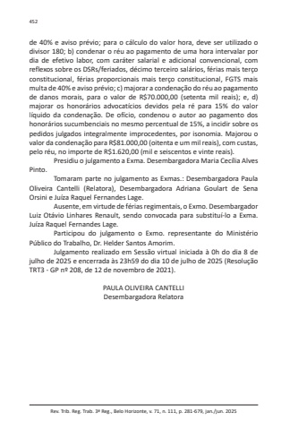 Rev. Trib. Reg. Trab. 3ª Reg., Belo Horizonte, v. 71, n. 111, p. 281-679, jan./jun. 2025452de 40% e aviso prévio; para o cálculo do valor hora, deve ser utilizado o divisor 180; b) condenar o réu ao pagamento de uma hora intervalar por dia de efetivo labor, com caráter salarial e adicional convencional, com reflexos sobre os DSRs/feriados, décimo terceiro salários, férias mais terço constitucional, férias proporcionais mais terço constitucional, FGTS mais multa de 40% e aviso prévio; c) majorar a condenação do réu ao pagamento de danos morais, para o valor de R$70.000,00 (setenta mil reais); e, d) majorar os honorários advocatícios devidos pela ré para 15% do valor líquido da condenação. De ofício, condenou o autor ao pagamento dos honorários sucumbenciais no mesmo percentual de 15%, a incidir sobre os pedidos julgados integralmente improcedentes, por isonomia. Majorou o valor da condenação para R$81.000,00 (oitenta e um mil reais), com custas, pelo réu, no importe de R$1.620,00 (mil e seiscentos e vinte reais).Presidiu o julgamento a Exma. Desembargadora Maria Cecília Alves Pinto.Tomaram parte no julgamento as Exmas.: Desembargadora Paula Oliveira Cantelli (Relatora), Desembargadora Adriana Goulart de Sena Orsini e Juíza Raquel Fernandes Lage.Ausente, em virtude de férias regimentais, o Exmo. Desembargador Luiz Otávio Linhares Renault, sendo convocada para substituí-lo a Exma. Juíza Raquel Fernandes Lage.Participou do julgamento o Exmo. representante do Ministério Público do Trabalho, Dr. Helder Santos Amorim.Julgamento realizado em Sessão virtual iniciada à 0h do dia 8 de julho de 2025 e encerrada às 23h59 do dia 10 de julho de 2025 (Resolução TRT3 - GP nº 208, de 12 de novembro de 2021).PAULA OLIVEIRA CANTELLIDesembargadora Relatora