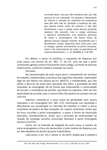 Rev. Trib. Reg. Trab. 3ª Reg., Belo Horizonte, v. 71, n. 111, p. 281-679, jan./jun. 2025457era chefe deles, mas que não mandava nele, que não passava de um rebaixado. Foi quando o Reclamante ao chamar a atenção do motorista da ambulância pelo fato dele não ter aceitado a mudança de rota, que aquela ordem vinha da empresa e não dele diretamente e que o colega Isaias deveria portando obedecer tão somente, mas o colega continuou a agredi-lo verbalmente, com palavras ofensivas de modo a constrangê-lo, daí houve trocas de ofensas mútuas naquele instante. Ressaltando que o Reclamante sempre dispensou bom trato para com os colegas, agindo serenamente de forma tranquila, como é de conhecimento de todos os operadores da empresa Reclamada (...) - Id. 3b58f00, fl. 3 do PDF.Em defesa, a parte ré justificou a imposição da dispensa por justa causa, nos termos do art. 482, “j”, da CLT, uma vez que a parte reclamante agrediu verbal e fisicamente outro colega, na frente de diversas testemunhas, conforme relatório anexado nos autos.Pois bem.Na caracterização da justa causa para o rompimento do contrato de trabalho, indispensável a presença dos seguintes requisitos: capitulação legal do ato faltoso nas alíneas do art. 482/CLT; a imediatidade, que não afasta o decurso do prazo para apuração dos fatos; a gravidade da falta imputável ao empregado, de tal monta que impossibilite a continuidade do vínculo; a inexistência de perdão, seja tácito ou expresso; além da não duplicidade de punição, pois a mesma falta não poderá ser punida mais de uma vez.Ademais, tratando-se a justa causa da penalidade mais severa imputável a um empregado (art. 482. CLT), manchando sua reputação e dificultando sua recolocação no mercado de trabalho, é mister a prova inconteste da prática do fato ensejador da ruptura contratual, sendo que tal ônus incumbe a parte empregadora, a quem a forma de dissolução aproveita, considerando-se, ainda, que o princípio da continuidade da relação de emprego constitui presunção favorável à parte empregada (Súmula 212/TST).Assim, em se tratando de alegação de justa causa, é sempre da parte empregadora o ônus de demonstrar o justo motivo da dispensa, por ser fato obstativo do direito da parte trabalhadora.Lado outro, o art. 10, II, alínea ‘a’, do ADCT, dispõe que é vedada a