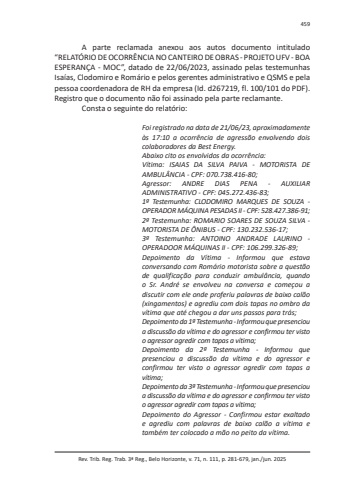 Rev. Trib. Reg. Trab. 3ª Reg., Belo Horizonte, v. 71, n. 111, p. 281-679, jan./jun. 2025459A parte reclamada anexou aos autos documento intitulado “RELATÓRIO DE OCORRÊNCIA NO CANTEIRO DE OBRAS - PROJETO UFV - BOA ESPERANÇA - MOC”, datado de 22/06/2023, assinado pelas testemunhas Isaías, Clodomiro e Romário e pelos gerentes administrativo e QSMS e pela pessoa coordenadora de RH da empresa (Id. d267219, fl. 100/101 do PDF). Registro que o documento não foi assinado pela parte reclamante.Consta o seguinte do relatório:Foi registrado na data de 21/06/23, aproximadamente às 17:10 a ocorrência de agressão envolvendo dois colaboradores da Best Energy.Abaixo cito os envolvidos da ocorrência:Vítima: ISAIAS DA SILVA PAIVA - MOTORISTA DE AMBULÂNCIA - CPF: 070.738.416-80;Agressor: ANDRE DIAS PENA - AUXILIAR ADMINISTRATIVO - CPF: 045.272.436-83;1ª Testemunha: CLODOMIRO MARQUES DE SOUZA - OPERADOR MÁQUINA PESADAS II - CPF: 528.427.386-91;2ª Testemunha: ROMARIO SOARES DE SOUZA SILVA - MOTORISTA DE ÔNIBUS - CPF: 130.232.536-17;3ª Testemunha: ANTOINO ANDRADE LAURINO - OPERADOOR MÁQUINAS II - CPF: 106.299.326-89;Depoimento da Vítima - Informou que estava conversando com Romário motorista sobre a questão de qualificação para conduzir ambulância, quando o Sr. André se envolveu na conversa e começou a discutir com ele onde proferiu palavras de baixo calão (xingamentos) e agrediu com dois tapas no ombro da vítima que até chegou a dar uns passos para trás;Depoimento da 1ª Testemunha - Informou que presenciou a discussão da vítima e do agressor e confirmou ter visto o agressor agredir com tapas a vítima;Depoimento da 2ª Testemunha - Informou que presenciou a discussão da vítima e do agressor e confirmou ter visto o agressor agredir com tapas a vítima;Depoimento da 3ª Testemunha - Informou que presenciou a discussão da vítima e do agressor e confirmou ter visto o agressor agredir com tapas a vítima;Depoimento do Agressor - Confirmou estar exaltado e agrediu com palavras de baixo calão a vítima e também ter colocado a mão no peito da vítima.