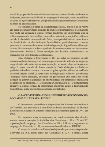 46Rev. Trib. Reg. Trab. 3ª Reg., Belo Horizonte, v. 71, n. 111, p. 33-58, jan./jun. 2025social de grupos desfavorecidos historicamente, como afro-descendentes ou indígenas, com acesso facilitado ao emprego e à educação, como as políticas de cotas ou ações afirmativas, que já tinham sido propostas nessa Convenção há mais de quarenta anos.No entanto, ao tratar da discriminação racial, étnica e ao se referir em geral às características estáveis de grupo e/ou hereditárias, a Convenção não pôde ser aplicada a outras formas modernas de intolerância que se refletem no mundo do trabalho, como a discriminação por opiniões políticas, devido à obesidade ou capacidade física, soro-positividade ou outra forma de intolerância. A discriminação homofóbica, particularmente comum, permanece como uma lacuna no âmbito da proteção à igualdade e afirmação da não discriminação e sobre a qual não há consenso para um instrumento internacional, devido à férrea oposição dos Estados confessionais, ou marcados por forte tradição confessional.Não obstante, a Convenção n. 111, ao tratar do princípio da não discriminação de forma geral, porém especificamente aplicada ao emprego ou profissão, não sofre da mesma limitação, ao conter duas definições no artigo 1, uma tratando de forma ampla de “toda distinção, exclusão ou preferência fundada em raça, cor, sexo, religião, opinião política, ascendência nacional, origem social”, e outra como definição geral e flexível que abrange “qualquer outra distinção, exclusão ou preferência que tenha por efeito destruir ou alterar a igualdade de oportunidades ou tratamento em matéria de emprego ou profissão...”. Dessa feita a Convenção n. 111 é perfeitamente aplicável a outras formas de intolerância modernas como a discriminação homofóbica, ainda que restrita ao mundo do trabalho.O PACTO INTERNACIONAL DE DIREITOS ECONÔMICOS, SOCIAIS E CULTURAIS - PIDESCO instrumento que reflete as disposições das Normas Internacionais do Trabalho, por excelência, é sem dúvida o Pacto Internacional de Direitos Econômicos, Sociais e Culturais votado pela assembléia geral da ONU em 1966.Os aspectos mais operacionais da implementação dos direitos sociais como a inspeção do trabalho, dos Convênios n. 81 e 129 da OIT, a promoção do emprego, dos Convênios n. 88 e 159, ou a segurança no emprego do Convênio n. 158, encontrar-se-ão refletidos no PIDESC.O tempo de trabalho ou limitação da jornada que consta do primeiro Convênio da OIT, assim como dos Convênios n. 7, 47 e outros, estará