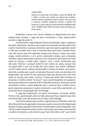 Rev. Trib. Reg. Trab. 3ª Reg., Belo Horizonte, v. 71, n. 111, p. 281-679, jan./jun. 2025460CONCLUSÃODiante do relato dos envolvidos o setor de QSMS, RH e ADM, concluiu que existiu um desvio de conduta, caracterizando agressão verbal e física, ato esse que a empresa repudia conforme normas e política da empresa e como ação foi determinado o desligamento do Sr. ANDRE DIAS PENA (membro eleito da Cipa) por justa causa.Produzida a prova oral, foram colhidos os depoimentos de duas testemunhas ouvidas a rogo da parte reclamante e duas testemunhas ouvidas a rogo da parte ré.A testemunha Hugo Nadyson Soares de Almeida, sobre a dispensa da parte reclamante, declarou que estava no momento da discussão entre a parte reclamante e a pessoa motorista; que teve apenas agressão verbal e não teve contato físico; que a empresa disse que houve contato físico, mas não houve; que teve agressão verbal entre André e Isaías; que Isaías xingou André primeiro, e aí a parte reclamante revidou; que a empresa mandou a parte reclamante conversar com Isaías para que ficasse até mais tarde no serviço; e então Isaías “apelou” com a parte reclamante; que não sabe informar o porquê André foi dar ordens ao Isaías, porque não era papel dele e nem era função dar essa ordem; que André trabalhava no RH e batia ponto, cobrava alimentação e olhava os ônibus; que após o ocorrido, acredita que a parte reclamante ficou por mais uns dois dias e foi dispensado; que André foi até Isaías para falar que deveria ficar até mais tarde no serviço; que Isaías “cresceu” e disse que André não mandava na empresa e mandou André “se lascar”; que a parte depoente era ajudante; que questionado como sabe da ordem dada pela empresa, disse que a parte reclamante contou a parte depoente que a empresa deu a ordem; que a parte depoente perguntou à parte reclamante o que tinha acontecido, no outro dia (início da gravação até 7min25seg).A segunda testemunha da parte reclamante, Fernando Walter Pereira Lima, questionado sobre os fatos disse que ficou sabendo que teve uma discussão, mas não presenciou os fatos (15min20seg).A primeira testemunha ouvida a rogo da parte reclamada, Isaías da Silva Paiva (vítima da agressão), disse que a parte reclamante foi dispensada porque na época agrediu fisicamente e verbalmente a parte depoente; que não foi a parte depoente quem iniciou a discussão; que estava conversando no pátio da empresa, uma conversa que “que não cabia a ele”; que André