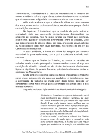 Rev. Trib. Reg. Trab. 3ª Reg., Belo Horizonte, v. 71, n. 111, p. 281-679, jan./jun. 2025463“revitimizá-lo”, submetendo-a a situação desnecessária e invasiva de reviver a violência sofrida, o que não se pode mais tolerar numa sociedade que visa reconhecer a dignidade humana em todas as suas nuances.Aliás, é de se destacar que a palavra da vítima, em casos como o dos autos, ostenta valor probante suficiente, notadamente porque não há contradições relevantes.Na hipótese, é indubitável que a conduta da parte autora é reprovável, visto que representa comportamento desrespeitoso no ambiente de trabalho. Não há razão jurídica ou moral que justifique, atualmente, qualquer tratamento diferenciado entre as pessoas, visto que independente de gênero, idade, cor, raça, orientação sexual, religião ou nacionalidade todos têm igual dignidade, nos termos do art. 5º, da Constituição da República.A toda evidência, a honra da vítima foi atingida por conduta reprovável da parte reclamante, com a qual a sociedade atual não mais coaduna.Saliento que o Direito do Trabalho, ao tutelar as relações de trabalho, tutela o meio pelo qual o homem médio comum alcança sua condição de cidadão, tratando-se de direito fundamental diretamente ligado à dignidade da pessoa humana, princípio-fundamento basilar e norteador da Magna Carta.Muito embora o sistema capitalista tenha enquadrado o trabalho como mero instrumento do processo produtivo, é incontroverso que a significação do trabalho vai muito além deste limite, devendo ser considerado como meio efetivo para a promoção da justiça social e dos direitos humanos.Segundo a valorosa lição do Ministro Mauricio Godinho Delgado:“O Direito do Trabalho corresponde à dimensão social mais significativa dos Direitos Humanos, ao lado do Direito Previdenciário (ou Direito da Seguridade Social). É por meio desses ramos jurídicos que os Direitos Humanos ganham maior espaço de evolução, ultrapassando as fronteiras originais, vinculadas basicamente à dimensão da liberdade e intangibilidade física e psíquica da pessoa humana.O universo social, econômico e cultural dos Direitos Humanos passa, de modo lógico e necessário, pelo ramo jurídico trabalhista, à medida que este regula a principal modalidade de inserção dos indivíduos no