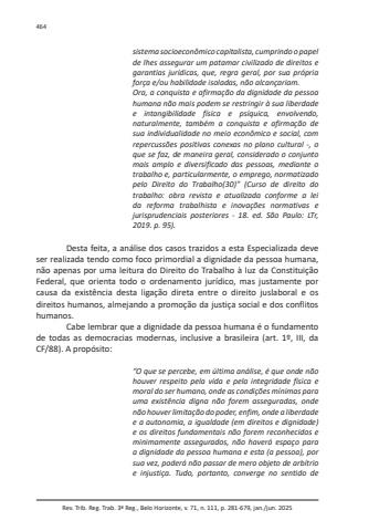 Rev. Trib. Reg. Trab. 3ª Reg., Belo Horizonte, v. 71, n. 111, p. 281-679, jan./jun. 2025464sistema socioeconômico capitalista, cumprindo o papel de lhes assegurar um patamar civilizado de direitos e garantias jurídicas, que, regra geral, por sua própria força e/ou habilidade isoladas, não alcançariam.Ora, a conquista e afirmação da dignidade da pessoa humana não mais podem se restringir à sua liberdade e intangibilidade física e psíquica, envolvendo, naturalmente, também a conquista e afirmação de sua individualidade no meio econômico e social, com repercussões positivas conexas no plano cultural -, o que se faz, de maneira geral, considerado o conjunto mais amplo e diversificado das pessoas, mediante o trabalho e, particularmente, o emprego, normatizado pelo Direito do Trabalho(30)” (Curso de direito do trabalho: obra revista e atualizada conforme a lei da reforma trabalhista e inovações normativas e jurisprudenciais posteriores - 18. ed. São Paulo: LTr, 2019. p. 95).Desta feita, a análise dos casos trazidos a esta Especializada deve ser realizada tendo como foco primordial a dignidade da pessoa humana, não apenas por uma leitura do Direito do Trabalho à luz da Constituição Federal, que orienta todo o ordenamento jurídico, mas justamente por causa da existência desta ligação direta entre o direito juslaboral e os direitos humanos, almejando a promoção da justiça social e dos conflitos humanos.Cabe lembrar que a dignidade da pessoa humana é o fundamento de todas as democracias modernas, inclusive a brasileira (art. 1º, III, da CF/88). A propósito:“O que se percebe, em última análise, é que onde não houver respeito pela vida e pela integridade física e moral do ser humano, onde as condições mínimas para uma existência digna não forem asseguradas, onde não houver limitação do poder, enfim, onde a liberdade e a autonomia, a igualdade (em direitos e dignidade) e os direitos fundamentais não forem reconhecidos e minimamente assegurados, não haverá espaço para a dignidade da pessoa humana e esta (a pessoa), por sua vez, poderá não passar de mero objeto de arbítrio e injustiça. Tudo, portanto, converge no sentido de