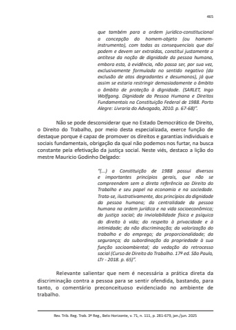 Rev. Trib. Reg. Trab. 3ª Reg., Belo Horizonte, v. 71, n. 111, p. 281-679, jan./jun. 2025465que também para a ordem jurídico-constitucional a concepção do homem-objeto (ou homeminstrumento), com todas as consequenciais que daí podem e devem ser extraídas, constitui justamente a antítese da noção de dignidade da pessoa humana, embora esta, à evidência, não possa ser, por sua vez, exclusivamente formulada no sentido negativo (da exclusão de atos degradantes e desumanos), já que assim se estaria restringir demasiadamente o âmbito o âmbito de proteção à dignidade. (SARLET, Ingo Wolfgang. Dignidade da Pessoa Humana e Direitos Fundamentais na Constituição Federal de 1988. Porto Alegre: Livraria do Advogado, 2010. p. 67-68)”.Não se pode desconsiderar que no Estado Democrático de Direito, o Direito do Trabalho, por meio desta especializada, exerce função de destaque porque é capaz de promover os direitos e garantias individuais e sociais fundamentais, obrigação da qual não podemos nos furtar, na busca constante pela efetivação da justiça social. Neste viés, destaco a lição do mestre Mauricio Godinho Delgado:“(...) a Constituição de 1988 possui diversos e importantes princípios gerais, que não se compreendem sem a direta referência ao Direito do Trabalho e seu papel na economia e na sociedade. Trata-se, ilustrativamente, dos princípios da dignidade da pessoa humana; da centralidade da pessoa humana na ordem jurídica e na vida socioeconômica; da justiça social; da inviolabilidade física e psíquica do direito à vida; do respeito à privacidade e à intimidade; da não discriminação; da valorização do trabalho e do emprego; da proporcionalidade; da segurança; da subordinação da propriedade à sua função socioambiental; da vedação do retrocesso social (Curso de Direito do Trabalho. 17ª ed. São Paulo, LTr - 2018. p. 65)”.Relevante salientar que nem é necessária a prática direta da discriminação contra a pessoa para se sentir ofendida, bastando, para tanto, o comentário preconceituoso evidenciado no ambiente de trabalho.