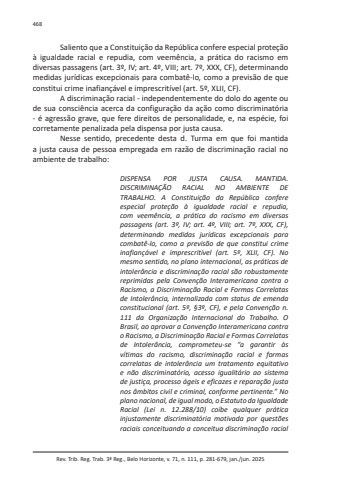 Rev. Trib. Reg. Trab. 3ª Reg., Belo Horizonte, v. 71, n. 111, p. 281-679, jan./jun. 2025468Saliento que a Constituição da República confere especial proteção à igualdade racial e repudia, com veemência, a prática do racismo em diversas passagens (art. 3º, IV; art. 4º, VIII; art. 7º, XXX, CF), determinando medidas jurídicas excepcionais para combatê-lo, como a previsão de que constitui crime inafiançável e imprescritível (art. 5º, XLII, CF).A discriminação racial - independentemente do dolo do agente ou de sua consciência acerca da configuração da ação como discriminatória - é agressão grave, que fere direitos de personalidade, e, na espécie, foi corretamente penalizada pela dispensa por justa causa.Nesse sentido, precedente desta d. Turma em que foi mantida a justa causa de pessoa empregada em razão de discriminação racial no ambiente de trabalho:DISPENSA POR JUSTA CAUSA. MANTIDA. DISCRIMINAÇÃO RACIAL NO AMBIENTE DE TRABALHO. A Constituição da República confere especial proteção à igualdade racial e repudia, com veemência, a prática do racismo em diversas passagens (art. 3º, IV; art. 4º, VIII; art. 7º, XXX, CF), determinando medidas jurídicas excepcionais para combatê-lo, como a previsão de que constitui crime inafiançável e imprescritível (art. 5º, XLII, CF). No mesmo sentido, no plano internacional, as práticas de intolerância e discriminação racial são robustamente reprimidas pela Convenção Interamericana contra o Racismo, a Discriminação Racial e Formas Correlatas de Intolerância, internalizada com status de emenda constitucional (art. 5º, §3º, CF), e pela Convenção n. 111 da Organização Internacional do Trabalho. O Brasil, ao aprovar a Convenção Interamericana contra o Racismo, a Discriminação Racial e Formas Correlatas de Intolerância, comprometeu-se “a garantir às vítimas do racismo, discriminação racial e formas correlatas de intolerância um tratamento equitativo e não discriminatório, acesso igualitário ao sistema de justiça, processo ágeis e eficazes e reparação justa nos âmbitos civil e criminal, conforme pertinente.” No plano nacional, de igual modo, o Estatuto da Igualdade Racial (Lei n. 12.288/10) coíbe qualquer prática injustamente discriminatória motivada por questões raciais conceituando a conceitua discriminação racial