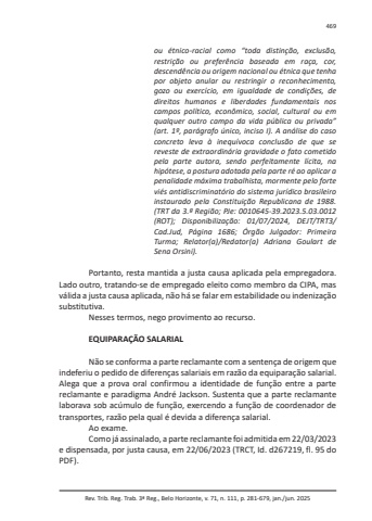 Rev. Trib. Reg. Trab. 3ª Reg., Belo Horizonte, v. 71, n. 111, p. 281-679, jan./jun. 2025469ou étnico-racial como “toda distinção, exclusão, restrição ou preferência baseada em raça, cor, descendência ou origem nacional ou étnica que tenha por objeto anular ou restringir o reconhecimento, gozo ou exercício, em igualdade de condições, de direitos humanos e liberdades fundamentais nos campos político, econômico, social, cultural ou em qualquer outro campo da vida pública ou privada” (art. 1º, parágrafo único, inciso I). A análise do caso concreto leva à inequívoca conclusão de que se reveste de extraordinária gravidade o fato cometido pela parte autora, sendo perfeitamente lícita, na hipótese, a postura adotada pela parte ré ao aplicar a penalidade máxima trabalhista, mormente pelo forte viés antidiscriminatório do sistema jurídico brasileiro instaurado pela Constituição Republicana de 1988. (TRT da 3.ª Região; PJe: 0010645-39.2023.5.03.0012 (ROT); Disponibilização: 01/07/2024, DEJT/TRT3/Cad.Jud, Página 1686; Órgão Julgador: Primeira Turma; Relator(a)/Redator(a) Adriana Goulart de Sena Orsini).Portanto, resta mantida a justa causa aplicada pela empregadora. Lado outro, tratando-se de empregado eleito como membro da CIPA, mas válida a justa causa aplicada, não há se falar em estabilidade ou indenização substitutiva.Nesses termos, nego provimento ao recurso.EQUIPARAÇÃO SALARIALNão se conforma a parte reclamante com a sentença de origem que indeferiu o pedido de diferenças salariais em razão da equiparação salarial. Alega que a prova oral confirmou a identidade de função entre a parte reclamante e paradigma André Jackson. Sustenta que a parte reclamante laborava sob acúmulo de função, exercendo a função de coordenador de transportes, razão pela qual é devida a diferença salarial.Ao exame.Como já assinalado, a parte reclamante foi admitida em 22/03/2023 e dispensada, por justa causa, em 22/06/2023 (TRCT, Id. d267219, fl. 95 do PDF).