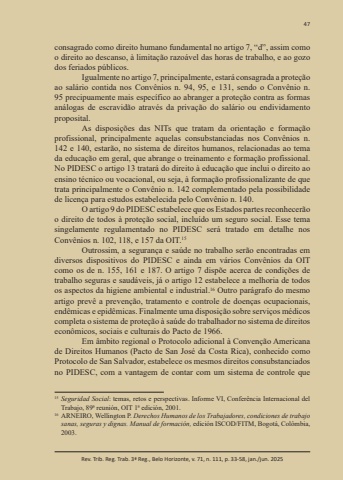 47Rev. Trib. Reg. Trab. 3ª Reg., Belo Horizonte, v. 71, n. 111, p. 33-58, jan./jun. 2025consagrado como direito humano fundamental no artigo 7, “d”, assim como o direito ao descanso, à limitação razoável das horas de trabalho, e ao gozo dos feriados públicos.Igualmente no artigo 7, principalmente, estará consagrada a proteção ao salário contida nos Convênios n. 94, 95, e 131, sendo o Convênio n. 95 precipuamente mais específico ao abranger a proteção contra as formas análogas de escravidão através da privação do salário ou endividamento proposital.As disposições das NITs que tratam da orientação e formação profissional, principalmente aquelas consubstanciadas nos Convênios n. 142 e 140, estarão, no sistema de direitos humanos, relacionadas ao tema da educação em geral, que abrange o treinamento e formação profissional. No PIDESC o artigo 13 tratará do direito à educação que inclui o direito ao ensino técnico ou vocacional, ou seja, à formação profissionalizante de que trata principalmente o Convênio n. 142 complementado pela possibilidade de licença para estudos estabelecida pelo Convênio n. 140.O artigo 9 do PIDESC estabelece que os Estados partes reconhecerão o direito de todos à proteção social, incluído um seguro social. Esse tema singelamente regulamentado no PIDESC será tratado em detalhe nos Convênios n. 102, 118, e 157 da OIT.15Outrossim, a segurança e saúde no trabalho serão encontradas em diversos dispositivos do PIDESC e ainda em vários Convênios da OIT como os de n. 155, 161 e 187. O artigo 7 dispõe acerca de condições de trabalho seguras e saudáveis, já o artigo 12 estabelece a melhoria de todos os aspectos da higiene ambiental e industrial.16 Outro parágrafo do mesmo artigo prevê a prevenção, tratamento e controle de doenças ocupacionais, endêmicas e epidêmicas. Finalmente uma disposição sobre serviços médicos completa o sistema de proteção à saúde do trabalhador no sistema de direitos econômicos, sociais e culturais do Pacto de 1966.Em âmbito regional o Protocolo adicional à Convenção Americana de Direitos Humanos (Pacto de San José da Costa Rica), conhecido como Protocolo de San Salvador, estabelece os mesmos direitos consubstanciados no PIDESC, com a vantagem de contar com um sistema de controle que 15 Seguridad Social: temas, retos e perspectivas. Informe VI, Conferência Internacional del Trabajo, 89ª reunión, OIT 1ª edición, 2001. 16 ARNEIRO, Wellington P. Derechos Humanos de los Trabajadores, condiciones de trabajo sanas, seguras y dignas. Manual de formación, edición ISCOD/FITM, Bogotá, Colômbia, 2003.