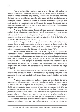 Rev. Trib. Reg. Trab. 3ª Reg., Belo Horizonte, v. 71, n. 111, p. 281-679, jan./jun. 2025470Assim esclarecido, registro que o art. 461 da CLT define os pressupostos para a equiparação salarial, quais sejam: mesmo empregador; mesmo estabelecimento empresarial, identidade de funções, trabalho de igual valor, considerado aquele feito com idêntica produtividade e perfeição técnica. Estabelece, ainda, o referido dispositivo legal que não será possível a equiparação se a diferença de tempo de serviço para o mesmo empregador for superior a quatro anos e a diferença de tempo na função for superior a dois anos.A prova da identidade funcional (que pressupõe igualdade de atribuições, e não apenas semelhança) cabe à parte autora por se tratar de fato constitutivo do seu direito, sendo da parte ré o ônus de comprovar os fatos impeditivos, modificativos ou extintivos (artigos 818, II, da CLT e 373, II, do CPC e Súmula 06, item VIII, do TST).Outrossim, para efeito da equiparação, importa avaliar o tempo de serviço da parte reclamante e do paradigma no exercício da mesma função, desempenhando as mesmas tarefas, não importando se os cargos têm, ou não, a mesma denominação (Súmula 06, itens II e III, do TST).Relembro que a nomenclatura dada aos cargos, por si só, não tem o condão de afastar a pretendida equiparação, desde que comprovado que os empregados, embora ocupantes de cargos com nomenclaturas distintas, exerciam as mesmas funções, ônus da parte reclamante, nos termos da Súmula 6 do TST. Isto porque, a realidade efetivamente vivenciada pelas partes deve prevalecer em detrimento das formalidades pactuadas, à luz do princípio da primazia da realidade sobre a forma, insculpido no artigo 9º da CLT.In casu, narra a parte autora que, durante todo o curso do contrato de trabalho, exerceu as mesmas atividades que a pessoa paradigma André Jackson e Soemar, realizando trabalho com igual produtividade e perfeição técnica.A parte reclamada, em defesa, negou as assertivas da parte reclamante, alegando que a pessoa paradigma André Jackson exercia a função de encarregado de transportes, coordenando uma equipe de 12 colaboradores, cujas funções eram: “(...) coordenar todo tipo de transporte que ocorre dentro do site, de modo que qualquer maquinário pesado utilizado na obra, bem como caminhão é de responsabilidade deste colaborador. (...) planejar as rotas, os períodos de movimentação, pela manutenção dos equipamentos e pela gestão de operadores e motoristas. (...) realizar as medições relativas aos transportes e maquinários utilizados na obra, medições estas que são utilizadas para pagamento dentro do