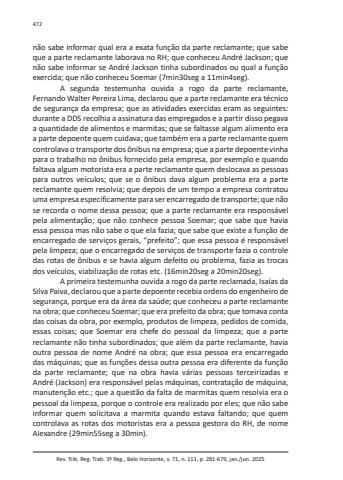Rev. Trib. Reg. Trab. 3ª Reg., Belo Horizonte, v. 71, n. 111, p. 281-679, jan./jun. 2025472não sabe informar qual era a exata função da parte reclamante; que sabe que a parte reclamante laborava no RH; que conheceu André Jackson; que não sabe informar se André Jackson tinha subordinados ou qual a função exercida; que não conheceu Soemar (7min30seg a 11min4seg).A segunda testemunha ouvida a rogo da parte reclamante, Fernando Walter Pereira Lima, declarou que a parte reclamante era técnico de segurança da empresa; que as atividades exercidas eram as seguintes: durante a DDS recolhia a assinatura das empregados e a partir disso pegava a quantidade de alimentos e marmitas; que se faltasse algum alimento era a parte depoente quem cuidava; que também era a parte reclamante quem controlava o transporte dos ônibus na empresa; que a parte depoente vinha para o trabalho no ônibus fornecido pela empresa, por exemplo e quando faltava algum motorista era a parte reclamante quem deslocava as pessoas para outros veículos; que se o ônibus dava algum problema era a parte reclamante quem resolvia; que depois de um tempo a empresa contratou uma empresa especificamente para ser encarregado de transporte; que não se recorda o nome dessa pessoa; que a parte reclamante era responsável pela alimentação; que não conhece pessoa Soemar; que sabe que havia essa pessoa mas não sabe o que ela fazia; que sabe que existe a função de encarregado de serviços gerais, “prefeito”; que essa pessoa é responsável pela limpeza; que o encarregado de serviços de transporte fazia o controle das rotas de ônibus e se havia algum defeito ou problema, fazia as trocas dos veículos, viabilização de rotas etc. (16min20seg a 20min20seg).A primeira testemunha ouvida a rogo da parte reclamada, Isaías da Silva Paiva, declarou que a parte depoente recebia ordens do engenheiro de segurança, porque era da área da saúde; que conheceu a parte reclamante na obra; que conheceu Soemar; que era prefeito da obra; que tomava conta das coisas da obra, por exemplo, produtos de limpeza, pedidos de comida, essas coisas; que Soemar era chefe do pessoal da limpeza; que a parte reclamante não tinha subordinados; que além da parte reclamante, havia outra pessoa de nome André na obra; que essa pessoa era encarregado das máquinas; que as funções dessa outra pessoa era diferente da função da parte reclamante; que na obra havia várias pessoas terceirizadas e André (Jackson) era responsável pelas máquinas, contratação de máquina, manutenção etc.; que a questão da falta de marmitas quem resolvia era o pessoal da limpeza, porque o controle era realizado por eles; que não sabe informar quem solicitava a marmita quando estava faltando; que quem controlava as rotas dos motoristas era a pessoa gestora do RH, de nome Alexandre (29min55seg a 30min).