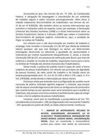 Rev. Trib. Reg. Trab. 3ª Reg., Belo Horizonte, v. 71, n. 111, p. 281-679, jan./jun. 2025475Acrescente-se que, nos termos do art. 7º, XXII, da Constituição Federal, é obrigação do empregador a manutenção de um ambiente de trabalho seguro e sadio, inclusive psicologicamente. Além disso, é vedado tratamento discriminatório ao trabalhador, nos termos do art. 1º da Lei nº 9.029/95. São também várias as normas internacionais que orientam o intérprete sobre tal aspecto, como, por exemplo, a Declaração Universal dos Direitos Humanos (1948) e o Pacto Internacional sobre os Direitos Econômicos, Sociais e Culturais (1969) que vedam o tratamento discriminatório de qualquer espécie, incluindo-se, aqui, a condição de litigar na Justiça do Trabalho.Em sintonia com a não discriminação em matéria de trabalho e emprego, insta ressaltar a Convenção 111 da OIT que afasta do ambiente laboral qualquer ato que vise distinguir ou excluir um determinado empregado, destruindo ou alterando a igualdade de oportunidade e tratamento por motivo injustamente desqualificante. E, ainda, a recente Convenção 190 da OIT, em processo de ratificação pelo Brasil, que trata da violência e assédio no mundo do trabalho, importante marco para o tema no âmbito de Proteção dos Direitos Humanos dos Trabalhadores.Desse modo, a prática de assédio moral é capaz de violar a honra subjetiva da pessoa trabalhadora, em afronta aos princípios da dignidade da pessoa humana, do valor social do trabalho e da função social da empresa/propriedade (arts. 1º, III e IV, 5º, XXII e XXIII e 170, caput, II, III e VIII, CRFB/88), sendo devida a indenização por danos morais.Esclareço ainda que entender que a configuração do assédio moral necessita de prática reiterada significa engessar o instituto, seja porque não há sequer previsão legal acerca de como se configuraria tal contumácia (por quanto tempo ou por quantas vezes seria necessário que o assédio se repetisse), seja porque uma única conduta é perfeitamente capaz de atingir e violar a honra subjetiva da pessoa trabalhadora.Inclusive, assim tem se manifestado a jurisprudência do Col. TST, considerando a Convenção n. 190, da Organização Internacional do Trabalho - OIT, aprovada em junho de 2019, já citada anteriormente. Confira-se:“I - AGRAVO DE INSTRUMENTO. RECURSO DE REVISTA. SUMARÍSSIMO. RECLAMANTE. LEI Nº 13.467/2017. TRANSCENDÊNCIA. INDENIZAÇÃO POR DANOS MORAIS. ASSÉDIO MORAL. DISCRIMINAÇÃO RACIAL. Deve ser reconhecida a transcendência jurídica para exame mais detido da controvérsia