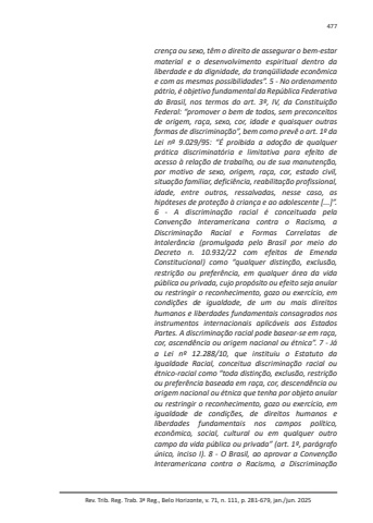 Rev. Trib. Reg. Trab. 3ª Reg., Belo Horizonte, v. 71, n. 111, p. 281-679, jan./jun. 2025477crença ou sexo, têm o direito de assegurar o bem-estar material e o desenvolvimento espiritual dentro da liberdade e da dignidade, da tranqüilidade econômica e com as mesmas possibilidades”. 5 - No ordenamento pátrio, é objetivo fundamental da República Federativa do Brasil, nos termos do art. 3º, IV, da Constituição Federal: “promover o bem de todos, sem preconceitos de origem, raça, sexo, cor, idade e quaisquer outras formas de discriminação”, bem como prevê o art. 1º da Lei nº 9.029/95: “É proibida a adoção de qualquer prática discriminatória e limitativa para efeito de acesso à relação de trabalho, ou de sua manutenção, por motivo de sexo, origem, raça, cor, estado civil, situação familiar, deficiência, reabilitação profissional, idade, entre outros, ressalvadas, nesse caso, as hipóteses de proteção à criança e ao adolescente [...]”. 6 - A discriminação racial é conceituada pela Convenção Interamericana contra o Racismo, a Discriminação Racial e Formas Correlatas de Intolerância (promulgada pelo Brasil por meio do Decreto n. 10.932/22 com efeitos de Emenda Constitucional) como “qualquer distinção, exclusão, restrição ou preferência, em qualquer área da vida pública ou privada, cujo propósito ou efeito seja anular ou restringir o reconhecimento, gozo ou exercício, em condições de igualdade, de um ou mais direitos humanos e liberdades fundamentais consagrados nos instrumentos internacionais aplicáveis aos Estados Partes. A discriminação racial pode basear-se em raça, cor, ascendência ou origem nacional ou étnica”. 7 - Já a Lei nº 12.288/10, que instituiu o Estatuto da Igualdade Racial, conceitua discriminação racial ou étnico-racial como “toda distinção, exclusão, restrição ou preferência baseada em raça, cor, descendência ou origem nacional ou étnica que tenha por objeto anular ou restringir o reconhecimento, gozo ou exercício, em igualdade de condições, de direitos humanos e liberdades fundamentais nos campos político, econômico, social, cultural ou em qualquer outro campo da vida pública ou privada” (art. 1º, parágrafo único, inciso I). 8 - O Brasil, ao aprovar a Convenção Interamericana contra o Racismo, a Discriminação