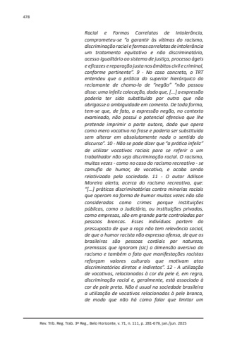 Rev. Trib. Reg. Trab. 3ª Reg., Belo Horizonte, v. 71, n. 111, p. 281-679, jan./jun. 2025478Racial e Formas Correlatas de Intolerância, comprometeu-se “a garantir às vítimas do racismo, discriminação racial e formas correlatas de intolerância um tratamento equitativo e não discriminatório, acesso igualitário ao sistema de justiça, processo ágeis e eficazes e reparação justa nos âmbitos civil e criminal, conforme pertinente”. 9 - No caso concreto, o TRT entendeu que a prática do superior hierárquico do reclamante de chama-lo de “negão” “não passou disso: uma infeliz colocação, dado que, [...] a expressão poderia ter sido substituída por outra que não abrigasse a ambiguidade em comento. De toda forma, tem-se que, de fato, a expressão negão, no contexto examinado, não possui o potencial ofensivo que lhe pretende imprimir a parte autora, dado que opera como mero vocativo na frase e poderia ser substituída sem alterar em absolutamente nada o sentido do discurso”. 10 - Não se pode dizer que “a prática infeliz” de utilizar vocativos raciais para se referir a um trabalhador não seja discriminação racial. O racismo, muitas vezes - como no caso do racismo recreativo - se camufla de humor, de vocativo, e acaba sendo relativizado pela sociedade. 11 - O autor Adilson Moreira alerta, acerca do racismo recreativo, que: “[...] práticas discriminatórias contra minorias raciais que operam na forma de humor muitas vezes não são consideradas como crimes porque instituições públicas, como o Judiciário, ou instituições privadas, como empresas, são em grande parte controladas por pessoas brancas. Esses indivíduos partem do pressuposto de que a raça não tem relevância social, de que o humor racista não expressa ofensa, de que os brasileiros são pessoas cordiais por natureza, premissas que ignoram (sic) a dimensão aversiva do racismo e também o fato que manifestações racistas reforçam valores culturais que motivam atos discriminatórios diretos e indiretos”. 12 - A utilização de vocativos, relacionados à cor da pele é, em regra, discriminação racial e, geralmente, está associado à cor de pele preta. Não é usual na sociedade brasileira a utilização de vocativos relacionados à pele branca, de modo que não há como falar que limitar um