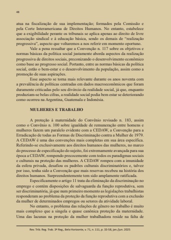 48Rev. Trib. Reg. Trab. 3ª Reg., Belo Horizonte, v. 71, n. 111, p. 33-58, jan./jun. 2025atua na fiscalização de sua implementação; formados pela Comissão e pela Corte Interamericana de Direitos Humanos. No entanto, estabelece que a exigibilidade perante os tribunais se aplica apenas ao direito de livre associação sindical e à educação básica, sendo os demais de “realização progressiva”, aspecto que voltaremos a nos referir em momento oportuno.Vale a pena ressaltar que a Convenção n. 117 sobre os objetivos e normas básicas da política social justamente aborda aspectos da realização progressiva de direitos sociais, preconizando o desenvolvimento econômico como base ao progresso social. Portanto, entre as normas básicas da política social, estão o bem-estar e o desenvolvimento da população, assim como a promoção de suas aspirações.Esse aspecto se torna mais relevante durante os anos noventa com a prevalência de políticas centradas em dados macroeconômicos que foram duramente criticadas pelo seu divórcio da realidade social, já que, enquanto produziam-se belas cifras, a realidade social podia bem estar se deteriorando como ocorreu na Argentina, Guatemala e Indonésia.MULHERES E TRABALHOA proteção à maternidade do Convênio revisado n. 183, assim como o Convênio n. 100 sobre igualdade de remuneração entre homens e mulheres fazem um paralelo evidente com a CEDAW, a Convenção para a Erradicação de todas as Formas de Discriminação contra a Mulher de 1979. A CEDAW é uma das convenções mais completas em sua área específica. Referindo-se exclusivamente aos direitos humanos das mulheres, no marco do processo de especificação do sujeito, foi extremamente avançada para sua época a CEDAW, rompendo precocemente com todos os paradigmas sociais e culturais na proteção das mulheres. A CEDAW rompeu com a imunidade da esfera privada, desafiou os padrões culturais discriminatórios e, talvez por isso, tenha sido a Convenção que mais reservas recebeu na história dos direitos humanos. Surpreendentemente tem sido amplamente ratificada.Especificamente o artigo 11 trata da eliminação da discriminação no emprego e contém disposições de salvaguarda da função reprodutiva, sem ser discriminatória, já que num primeiro momento as legislações trabalhistas responderam ao problema da proteção da função reprodutiva com a exclusão da mulher de determinados empregos ou setores da atividade laboral.No entanto, o problema das relações de gênero no trabalho é muito mais complexo que a singela e quase canônica proteção da maternidade. Uma das lacunas na proteção da mulher trabalhadora reside na falta de