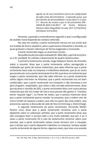 Rev. Trib. Reg. Trab. 3ª Reg., Belo Horizonte, v. 71, n. 111, p. 281-679, jan./jun. 2025480agente ou de sua consciência acerca da configuração da ação como discriminatória - é agressão grave, que fere direitos de personalidade e causa dano in re ipsa. 17 - Recurso de revista a que se dá provimento (RR - 20658-94.2019.5.04.0017; 6ª Turma; Relatora: Ministra Kátia Magalhães Arruda; DEJT 27/10/2023). (destaques acrescidos)Portanto, superado o entendimento segundo o qual a configuração do assédio moral depende de conduta reiterada.No caso em análise, a parte reclamante narrou em sua inicial que era tratada de forma vexatória, pelos supervisores Alexandre e Geraldo, os quais gritavam e faziam cobranças de forma exagerada e incessante.A parte reclamada negou as assertivas iniciais.Na audiência de instrução realizada (ID. 384c18e), cujo link encontrase o ID. ea16ba9, foi colhido o depoimento de quatro testemunhas.A primeira testemunha ouvida, Hugo Nadyson Soares de Almeida, sobre o assunto, disse que a parte reclamante sofreu perseguição e retaliação por parte de outros motoristas; que sabe informar que a parte reclamante fazia tudo na empresa e trabalhava bastante; que já viu outra pessoa discutir com a parte reclamante lá no RH; que teve um motorista que xingou a parte reclamante; que não sabe informar se a parte reclamante sofreu algum mal-estar na empresa; que a parte reclamante era um bom colaborador; que a parte reclamante era tranquilo e não levantava a voz para ninguém, respeitador; que sobre o fato narrado anteriormente, disse que durante a reunião de DDS, a parte reclamante falou com outra pessoa motorista que ela iria mudar de rota e essa pessoa não gostou e “mandou tomar naquele lugar”, na frente de todos; que a pessoa motorista disse que a parte reclamante queria mandar na empresa; que a ordem vem de cima e André só repassa a ordem; que não viu quem deu essa ordem, mas presenciou apenas a discussão do lado de fora (11min5seg a 15min15seg).A segunda testemunha da parte reclamante, Fernando Walter Pereira Lima, disse que a parte reclamante reclamou com a parte depoente sobre as cobranças sofridas; que a parte reclamante disse que não conseguia fazer o serviço todo e era muito cobrado; que por 2 ou 3 vezes a parte reclamante foi à sala da testemunha reclamar sobre esse assunto; que a parte reclamante estava muito nervoso com a situação; que o tempo que a parte depoente trabalhou na empresa, tentava ajudar a parte reclamante de alguma forma, algumas vezes; que teve uma ocasião