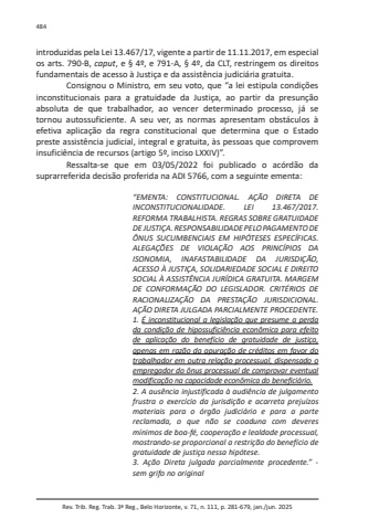 Rev. Trib. Reg. Trab. 3ª Reg., Belo Horizonte, v. 71, n. 111, p. 281-679, jan./jun. 2025484introduzidas pela Lei 13.467/17, vigente a partir de 11.11.2017, em especial os arts. 790-B, caput, e § 4º, e 791-A, § 4º, da CLT, restringem os direitos fundamentais de acesso à Justiça e da assistência judiciária gratuita.Consignou o Ministro, em seu voto, que “a lei estipula condições inconstitucionais para a gratuidade da Justiça, ao partir da presunção absoluta de que trabalhador, ao vencer determinado processo, já se tornou autossuficiente. A seu ver, as normas apresentam obstáculos à efetiva aplicação da regra constitucional que determina que o Estado preste assistência judicial, integral e gratuita, às pessoas que comprovem insuficiência de recursos (artigo 5º, inciso LXXIV)”.Ressalta-se que em 03/05/2022 foi publicado o acórdão da suprarreferida decisão proferida na ADI 5766, com a seguinte ementa:“EMENTA: CONSTITUCIONAL. AÇÃO DIRETA DE INCONSTITUCIONALIDADE. LEI 13.467/2017. REFORMA TRABALHISTA. REGRAS SOBRE GRATUIDADE DE JUSTIÇA. RESPONSABILIDADE PELO PAGAMENTO DE ÔNUS SUCUMBENCIAIS EM HIPÓTESES ESPECÍFICAS. ALEGAÇÕES DE VIOLAÇÃO AOS PRINCÍPIOS DA ISONOMIA, INAFASTABILIDADE DA JURISDIÇÃO, ACESSO À JUSTIÇA, SOLIDARIEDADE SOCIAL E DIREITO SOCIAL À ASSISTÊNCIA JURÍDICA GRATUITA. MARGEM DE CONFORMAÇÃO DO LEGISLADOR. CRITÉRIOS DE RACIONALIZAÇÃO DA PRESTAÇÃO JURISDICIONAL. AÇÃO DIRETA JULGADA PARCIALMENTE PROCEDENTE.1. É inconstitucional a legislação que presume a perda da condição de hipossuficiência econômica para efeito de aplicação do benefício de gratuidade de justiça, apenas em razão da apuração de créditos em favor do trabalhador em outra relação processual, dispensado o empregador do ônus processual de comprovar eventual modificação na capacidade econômica do beneficiário.2. A ausência injustificada à audiência de julgamento frustra o exercício da jurisdição e acarreta prejuízos materiais para o órgão judiciário e para a parte reclamada, o que não se coaduna com deveres mínimos de boa-fé, cooperação e lealdade processual, mostrando-se proporcional a restrição do benefício de gratuidade de justiça nessa hipótese.3. Ação Direta julgada parcialmente procedente.” - sem grifo no original