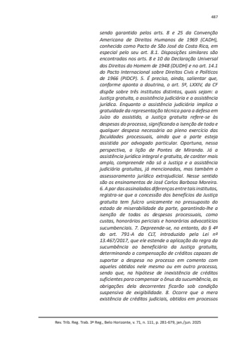 Rev. Trib. Reg. Trab. 3ª Reg., Belo Horizonte, v. 71, n. 111, p. 281-679, jan./jun. 2025487sendo garantido pelos arts. 8 e 25 da Convenção Americana de Direitos Humanos de 1969 (CADH), conhecida como Pacto de São José da Costa Rica, em especial pelo seu art. 8.1. Disposições similares são encontradas nos arts. 8 e 10 da Declaração Universal dos Direitos do Homem de 1948 (DUDH) e no art. 14.1 do Pacto Internacional sobre Direitos Civis e Políticos de 1966 (PIDCP). 5. É preciso, ainda, salientar que, conforme aponta a doutrina, o art. 5º, LXXIV, da CF dispõe sobre três institutos distintos, quais sejam: a Justiça gratuita, a assistência judiciária e a assistência jurídica. Enquanto a assistência judiciária implica a gratuidade da representação técnica para a defesa em Juízo do assistido, a Justiça gratuita refere-se às despesas do processo, significando a isenção de toda e qualquer despesa necessária ao pleno exercício das faculdades processuais, ainda que a parte esteja assistida por advogado particular. Oportuna, nessa perspectiva, a lição de Pontes de Miranda. Já a assistência jurídica integral e gratuita, de caráter mais amplo, compreende não só a Justiça e a assistência judiciária gratuitas, já mencionadas, mas também o assessoramento jurídico extrajudicial. Nesse sentido são os ensinamentos de José Carlos Barbosa Moreira. 6. A par das assinaladas diferenças entre tais institutos, registra-se que a concessão dos benefícios da Justiça gratuita tem fulcro unicamente no pressuposto do estado de miserabilidade da parte, garantindo-lhe a isenção de todas as despesas processuais, como custas, honorários periciais e honorários advocatícios sucumbenciais. 7. Depreende-se, no entanto, do § 4º do art. 791-A da CLT, introduzido pela Lei nº 13.467/2017, que ele estende a aplicação da regra da sucumbência ao beneficiário da Justiça gratuita, determinando a compensação de créditos capazes de suportar a despesa no processo em comento com aqueles obtidos nele mesmo ou em outro processo, sendo que, na hipótese de inexistência de créditos suficientes para compensar o ônus da sucumbência, as obrigações dela decorrentes ficarão sob condição suspensiva de exigibilidade. 8. Ocorre que a mera existência de créditos judiciais, obtidos em processos