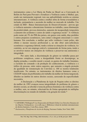 49Rev. Trib. Reg. Trab. 3ª Reg., Belo Horizonte, v. 71, n. 111, p. 33-58, jan./jun. 2025instrumentos como a Lei Maria da Penha no Brasil ou a Convenção de Belém do Pará para Prevenir e Erradicar a Violência contra a Mulher, que, sendo um instrumento regional, tem sua aplicabilidade restrita ao sistema interamericano. A violência contra a mulher afeta de forma avassaladora a inclusão, permanência e ascensão da mulher no mercado de trabalho. Um estudo do BID - Banco Interamericano de Desenvolvimento - provou que a violência aumenta o absenteísmo feminino no trabalho, causa diminuição da produtividade, provoca demissões, aumento da incapacidade temporária e aumento dos acidentes e custos de saúde e segurança social.17 A violência pode custar até 3% do PIB dos países, em gastos com saúde, dias perdidos e outros prejuízos econômicos, sem contar o desgaste emocional e o custo humano. Em conclusão, a mulher que sofre violência é mais pobre, não obtém o mesmo sucesso profissional e, ao não obter auto-suficiência econômica e segurança laboral, tende a tolerar as situações de violência. Ao contrário, ao ter um emprego estável e remunerado de forma justa, tende a se envolver menos em situações de violência e preservar sua autonomia e integridade.Por outro lado, a discriminação de gênero no trabalho passa por problemas complexos, como a desigualdade frente ao desemprego, as duplas jornadas, o assédio moral e sexual, os guetos do trabalho feminino, a exclusão do comando e da produção do conhecimento, a violência e o tráfico de pessoas, entre outros aspectos, que somente a singela proteção da igualdade de remuneração do Convênio n. 100 se mostra totalmente insuficiente. No entanto, os instrumentos de direitos humanos como a CEDAW tratam da problemática do trabalho da mulher de forma tangencial, diluídos no âmbito de outros direitos sociais, carecendo da especificidade necessária.A Declaração e a Plataforma de Ação de Pequim sobre os direitos da mulher de 1993 avançou nessa integralidade do problema de gênero e direitos sociais, ao abordar o tema da pobreza feminina e da violência contra a mulher, sem, no entanto, relacioná-las de forma apropriada às múltiplas discriminações no mundo do trabalho e da geração de renda.1817 CARNEIRO, Wellington P. Las Desposeidas del Mundo Global, Los Derechos Humanos de las Mujeres Trabajadoras. www.iidh.org.cr, Biblioteca virtual do instituto interamericano de direitos humanos, Costa Rica, março, 2003. 18 Declaración y Plataforma de Acción de Beijing, Naciones Unidas, New York, 2002.