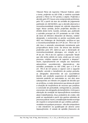 Rev. Trib. Reg. Trab. 3ª Reg., Belo Horizonte, v. 71, n. 111, p. 281-679, jan./jun. 2025493Tribunal Pleno do Supremo Tribunal Federal, sobre o tema, proferido na ADI 5766, a matéria suscitada perante o Pleno no TST perdeu o objeto. Proferida a decisão pelo STF, houve uma compreensão preliminar, pelo TST, a partir do teor da certidão de julgamento publicada em 20/10/2021, que a decisão abarcaria a inconstitucionalidade integral do referido dispositivo legal. Nesse sentido, foram proferidas decisões no âmbito desta Corte. Sucede, contudo, que, publicado o acórdão principal do STF prolatado na ADI 5766, da lavra do Ministro Alexandre de Moraes, redator designado, e esclarecidos os pontos suscitados pela AGU nos Embargos de Declaração, verificou-se que a inconstitucionalidade do § 4º do art. 791-A da CLT não teve a extensão vislumbrada inicialmente pela jurisprudência desta Corte. Da leitura das decisões proferidas pelo STF, infere-se que a declaração de inconstitucionalidade abrangeu, em relação ao § 4º do art. 791-A da CLT, apenas a expressão “desde que não tenha obtido em Juízo, ainda que em outro processo, créditos capazes de suportar a despesa”. Assim, especificamente em relação aos honorários advocatícios sucumbenciais, depreende-se, dos acórdãos prolatados na ADI 5766, que o § 4º do art. 791-A da CLT passou a vigorar com a seguinte redação: vencido o beneficiário da justiça gratuita, as obrigações decorrentes de sua sucumbência ficarão sob condição suspensiva de exigibilidade e somente poderão ser executadas se, nos dois anos subsequentes ao trânsito em julgado da decisão que as certificou, o credor demonstrar que deixou de existir a situação de insuficiência de recursos que justificou a concessão de gratuidade, extinguindo-se, passado, esse prazo, tais obrigações do beneficiário. Certo que a alteração da condição de hipossuficiência econômica do(a) trabalhador(a), ônus probatório do credor, não pode ser aquilatada a partir dos ganhos advindos de processo judicial. Assim, a modificação havida no artigo diz respeito à compreensão de que créditos judiciais - recebidos em qualquer processo - não são computáveis e não interferem na qualificação do obreiro como hipossuficiente. O estado de aptidão financeira do