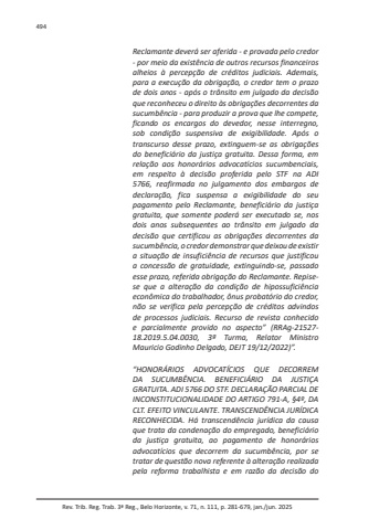 Rev. Trib. Reg. Trab. 3ª Reg., Belo Horizonte, v. 71, n. 111, p. 281-679, jan./jun. 2025494Reclamante deverá ser aferida - e provada pelo credor - por meio da existência de outros recursos financeiros alheios à percepção de créditos judiciais. Ademais, para a execução da obrigação, o credor tem o prazo de dois anos - após o trânsito em julgado da decisão que reconheceu o direito às obrigações decorrentes da sucumbência - para produzir a prova que lhe compete, ficando os encargos do devedor, nesse interregno, sob condição suspensiva de exigibilidade. Após o transcurso desse prazo, extinguem-se as obrigações do beneficiário da justiça gratuita. Dessa forma, em relação aos honorários advocatícios sucumbenciais, em respeito à decisão proferida pelo STF na ADI 5766, reafirmada no julgamento dos embargos de declaração, fica suspensa a exigibilidade do seu pagamento pelo Reclamante, beneficiário da justiça gratuita, que somente poderá ser executado se, nos dois anos subsequentes ao trânsito em julgado da decisão que certificou as obrigações decorrentes da sucumbência, o credor demonstrar que deixou de existir a situação de insuficiência de recursos que justificou a concessão de gratuidade, extinguindo-se, passado esse prazo, referida obrigação do Reclamante. Repisese que a alteração da condição de hipossuficiência econômica do trabalhador, ônus probatório do credor, não se verifica pela percepção de créditos advindos de processos judiciais. Recurso de revista conhecido e parcialmente provido no aspecto” (RRAg-21527-18.2019.5.04.0030, 3ª Turma, Relator Ministro Mauricio Godinho Delgado, DEJT 19/12/2022)”.“HONORÁRIOS ADVOCATÍCIOS QUE DECORREM DA SUCUMBÊNCIA. BENEFICIÁRIO DA JUSTIÇA GRATUITA. ADI 5766 DO STF. DECLARAÇÃO PARCIAL DE INCONSTITUCIONALIDADE DO ARTIGO 791-A, §4º, DA CLT. EFEITO VINCULANTE. TRANSCENDÊNCIA JURÍDICA RECONHECIDA. Há transcendência jurídica da causa que trata da condenação do empregado, beneficiário da justiça gratuita, ao pagamento de honorários advocatícios que decorrem da sucumbência, por se tratar de questão nova referente à alteração realizada pela reforma trabalhista e em razão da decisão do