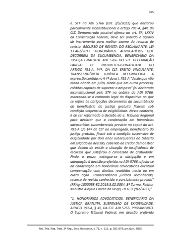 Rev. Trib. Reg. Trab. 3ª Reg., Belo Horizonte, v. 71, n. 111, p. 281-679, jan./jun. 2025495e. STF na ADI 5766 (DJE 3/5/2022) que declarou parcialmente inconstitucional o artigo 791-A, §4º, da CLT. Demonstrada possível ofensa ao art. 5º, LXXIV da Constituição Federal, deve ser provido o agravo de instrumento para melhor exame do recurso de revista. RECURSO DE REVISTA DO RECLAMANTE. LEI 13.467/2017. HONORÁRIOS ADVOCATÍCIOS QUE DECORREM DA SUCUMBÊNCIA. BENEFICIÁRIO DA JUSTIÇA GRATUITA. ADI 5766 DO STF. DECLARAÇÃO PARCIAL DE INCONSTITUCIONALIDADE DO ARTIGO 791-A, §4º, DA CLT. EFEITO VINCULANTE. TRANSCENDÊNCIA JURÍDICA RECONHECIDA. A expressão contida no § 4º do art. 791-A “desde que não tenha obtido em juízo, ainda que em outro processo, créditos capazes de suportar a despesa” foi declarada inconstitucional pelo STF na análise da ADI 5766, mantendo-se o comando legal do dispositivo no que se refere às obrigações decorrentes da sucumbência do beneficiário da justiça gratuita ficarem sob condição suspensiva de exigibilidade. Nesse contexto, é de ser reformada a decisão do e. Tribunal Regional para declarar que a condenação em honorários advocatícios sucumbenciais prevista no caput do art. 791-A c/c §4º da CLT ao empregado, beneficiário da justiça gratuita, ficará sob a condição suspensiva de exigibilidade por dois anos subsequentes ao trânsito em julgado da decisão, cabendo ao credor demonstrar que deixou de existir a situação de insuficiência de recursos que justificou a concessão de gratuidade. Findo o prazo, extingue-se a obrigação e em adequação à decisão proferida na ADI-5766, afasta-se da condenação em honorários advocatícios eventual compensação com direitos recebidos nesta ou em outra ação. Transcendência jurídica reconhecida, recurso de revista conhecido e parcialmente provido” (RRAg-1000058-82.2019.5.02.0084, 8ª Turma, Relator Ministro Aloysio Correa da Veiga, DEJT 03/02/2023)”.“1. HONORÁRIOS ADVOCATÍCIOS. BENEFICIÁRIO DA JUSTIÇA GRATUITA. SUSPENSÃO DE EXIGIBILIDADE. ARTIGO 791-A, § 4º, DA CLT. ADI 5766. PROVIMENTO. O Supremo Tribunal Federal, em decisão proferida