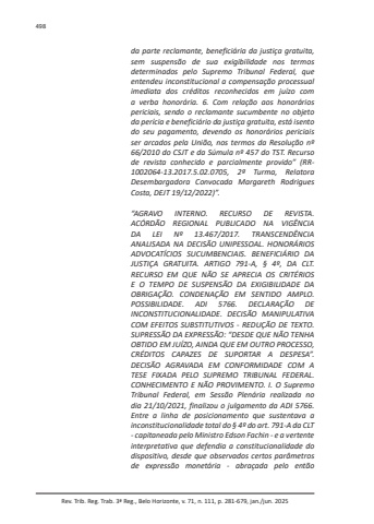 Rev. Trib. Reg. Trab. 3ª Reg., Belo Horizonte, v. 71, n. 111, p. 281-679, jan./jun. 2025498da parte reclamante, beneficiária da justiça gratuita, sem suspensão de sua exigibilidade nos termos determinados pelo Supremo Tribunal Federal, que entendeu inconstitucional a compensação processual imediata dos créditos reconhecidos em juízo com a verba honorária. 6. Com relação aos honorários periciais, sendo o reclamante sucumbente no objeto da perícia e beneficiário da justiça gratuita, está isento do seu pagamento, devendo os honorários periciais ser arcados pela União, nos termos da Resolução nº 66/2010 do CSJT e da Súmula nº 457 do TST. Recurso de revista conhecido e parcialmente provido” (RR1002064-13.2017.5.02.0705, 2ª Turma, Relatora Desembargadora Convocada Margareth Rodrigues Costa, DEJT 19/12/2022)”.“AGRAVO INTERNO. RECURSO DE REVISTA. ACÓRDÃO REGIONAL PUBLICADO NA VIGÊNCIA DA LEI Nº 13.467/2017. TRANSCENDÊNCIA ANALISADA NA DECISÃO UNIPESSOAL. HONORÁRIOS ADVOCATÍCIOS SUCUMBENCIAIS. BENEFICIÁRIO DA JUSTIÇA GRATUITA. ARTIGO 791-A, § 4º, DA CLT. RECURSO EM QUE NÃO SE APRECIA OS CRITÉRIOS E O TEMPO DE SUSPENSÃO DA EXIGIBILIDADE DA OBRIGAÇÃO. CONDENAÇÃO EM SENTIDO AMPLO. POSSIBILIDADE. ADI 5766. DECLARAÇÃO DE INCONSTITUCIONALIDADE. DECISÃO MANIPULATIVA COM EFEITOS SUBSTITUTIVOS - REDUÇÃO DE TEXTO. SUPRESSÃO DA EXPRESSÃO: “DESDE QUE NÃO TENHA OBTIDO EM JUÍZO, AINDA QUE EM OUTRO PROCESSO, CRÉDITOS CAPAZES DE SUPORTAR A DESPESA”. DECISÃO AGRAVADA EM CONFORMIDADE COM A TESE FIXADA PELO SUPREMO TRIBUNAL FEDERAL. CONHECIMENTO E NÃO PROVIMENTO. I. O Supremo Tribunal Federal, em Sessão Plenária realizada no dia 21/10/2021, finalizou o julgamento da ADI 5766. Entre a linha de posicionamento que sustentava a inconstitucionalidade total do § 4º do art. 791-A da CLT - capitaneada pelo Ministro Edson Fachin - e a vertente interpretativa que defendia a constitucionalidade do dispositivo, desde que observados certos parâmetros de expressão monetária - abraçada pelo então
