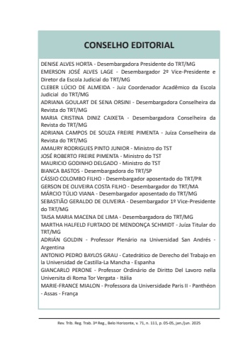 DENISE ALVES HORTA - Desembargadora Presidente do TRT/MGEMERSON JOSÉ ALVES LAGE - Desembargador 2º Vice-Presidente e Diretor da Escola Judicial do TRT/MGCLEBER LÚCIO DE ALMEIDA - Juiz Coordenador Acadêmico da Escola Judicial do TRT/MGADRIANA GOULART DE SENA ORSINI - Desembargadora Conselheira da Revista do TRT/MGMARIA CRISTINA DINIZ CAIXETA - Desembargadora Conselheira da Revista do TRT/MGADRIANA CAMPOS DE SOUZA FREIRE PIMENTA - Juíza Conselheira da Revista do TRT/MGAMAURY RODRIGUES PINTO JUNIOR - Ministro do TSTJOSÉ ROBERTO FREIRE PIMENTA - Ministro do TSTMAURICIO GODINHO DELGADO - Ministro do TSTBIANCA BASTOS - Desembargadora do TRT/SPCÁSSIO COLOMBO FILHO - Desembargador aposentado do TRT/PRGERSON DE OLIVEIRA COSTA FILHO - Desembargador do TRT/MAMÁRCIO TÚLIO VIANA - Desembargador aposentado do TRT/MGSEBASTIÃO GERALDO DE OLIVEIRA - Desembargador 1º Vice-Presidente do TRT/MGTAISA MARIA MACENA DE LIMA - Desembargadora do TRT/MGMARTHA HALFELD FURTADO DE MENDONÇA SCHMIDT - Juíza Titular do TRT/MGADRIÁN GOLDIN - Professor Plenário na Universidad San Andrés - ArgentinaANTONIO PEDRO BAYLOS GRAU - Catedrático de Derecho del Trabajo en la Universidad de Castilla-La Mancha - EspanhaGIANCARLO PERONE - Professor Ordinário de Diritto Del Lavoro nella Universita di Roma Tor Vergata - ItáliaMARIE-FRANCE MIALON - Professora da Universidade Paris II - Panthéon - Assas - FrançaCONSELHO EDITORIALRev. Trib. Reg. Trab. 3ª Reg., Belo Horizonte, v. 71, n. 111, p. 05-05, jan./jun. 2025