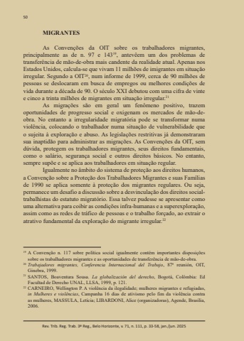 50Rev. Trib. Reg. Trab. 3ª Reg., Belo Horizonte, v. 71, n. 111, p. 33-58, jan./jun. 2025MIGRANTESAs Convenções da OIT sobre os trabalhadores migrantes, principalmente as de n. 97 e 14319, antevêem um dos problemas de transferência de mão-de-obra mais candente da realidade atual. Apenas nos Estados Unidos, calcula-se que vivam 11 milhões de imigrantes em situação irregular. Segundo a OIT20, num informe de 1999, cerca de 90 milhões de pessoas se deslocaram em busca de empregos ou melhores condições de vida durante a década de 90. O século XXI debutou com uma cifra de vinte e cinco a trinta milhões de migrantes em situação irregular.21As migrações são em geral um fenômeno positivo, trazem oportunidades de progresso social e oxigenam os mercados de mão-deobra. No entanto a irregularidade migratória pode se transformar numa violência, colocando o trabalhador numa situação de vulnerabilidade que o sujeita à exploração e abuso. As legislações restritivas já demonstraram sua inaptidão para administrar as migrações. As Convenções da OIT, sem dúvida, protegem os trabalhadores migrantes, seus direitos fundamentais, como o salário, segurança social e outros direitos básicos. No entanto, sempre supõe e se aplica aos trabalhadores em situação regular.Igualmente no âmbito do sistema de proteção aos direitos humanos, a Convenção sobre a Proteção dos Trabalhadores Migrantes e suas Famílias de 1990 se aplica somente à proteção dos migrantes regulares. Ou seja, permanece um desafio a discussão sobre a desvinculação dos direitos socialtrabalhistas do estatuto migratório. Essa talvez pudesse se apresentar como uma alternativa para coibir as condições infra-humanas e a superexploração, assim como as redes de tráfico de pessoas e o trabalho forçado, ao extrair o atrativo fundamental da exploração do migrante irregular.2219 A Convenção n. 117 sobre política social igualmente contém importantes disposições sobre os trabalhadores migrantes e as oportunidades de transferência de mão-de-obra. 20 Trabajadores migrantes, Conferencia Internacional del Trabajo, 87ª reunión, OIT, Ginebra, 1999. 21 SANTOS, Boaventura Sousa. La globalización del derecho, Bogotá, Colômbia: Ed Facultad de Derecho UNAL, LLSA, 1999, p. 121. 22 CARNEIRO, Wellington P. A violência da ilegalidade; mulheres migrantes e refugiadas, in Mulheres e violências, Campanha 16 dias de ativismo pelo fim da violência contra as mulheres, MASSULA, Letícia; LIBARDONI, Alice (organizadoras), Agende, Brasília, 2006.
