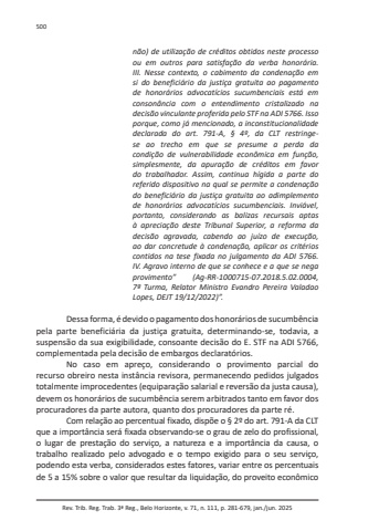 Rev. Trib. Reg. Trab. 3ª Reg., Belo Horizonte, v. 71, n. 111, p. 281-679, jan./jun. 2025500não) de utilização de créditos obtidos neste processo ou em outros para satisfação da verba honorária. III. Nesse contexto, o cabimento da condenação em si do beneficiário da justiça gratuita ao pagamento de honorários advocatícios sucumbenciais está em consonância com o entendimento cristalizado na decisão vinculante proferida pelo STF na ADI 5766. Isso porque, como já mencionado, a inconstitucionalidade declarada do art. 791-A, § 4º, da CLT restringese ao trecho em que se presume a perda da condição de vulnerabilidade econômica em função, simplesmente, da apuração de créditos em favor do trabalhador. Assim, continua hígida a parte do referido dispositivo na qual se permite a condenação do beneficiário da justiça gratuita ao adimplemento de honorários advocatícios sucumbenciais. Inviável, portanto, considerando as balizas recursais aptas à apreciação deste Tribunal Superior, a reforma da decisão agravada, cabendo ao juízo de execução, ao dar concretude à condenação, aplicar os critérios contidos na tese fixada no julgamento da ADI 5766. IV. Agravo interno de que se conhece e a que se nega provimento” (Ag-RR-1000715-07.2018.5.02.0004, 7ª Turma, Relator Ministro Evandro Pereira Valadao Lopes, DEJT 19/12/2022)”.Dessa forma, é devido o pagamento dos honorários de sucumbência pela parte beneficiária da justiça gratuita, determinando-se, todavia, a suspensão da sua exigibilidade, consoante decisão do E. STF na ADI 5766, complementada pela decisão de embargos declaratórios.No caso em apreço, considerando o provimento parcial do recurso obreiro nesta instância revisora, permanecendo pedidos julgados totalmente improcedentes (equiparação salarial e reversão da justa causa), devem os honorários de sucumbência serem arbitrados tanto em favor dos procuradores da parte autora, quanto dos procuradores da parte ré.Com relação ao percentual fixado, dispõe o § 2º do art. 791-A da CLT que a importância será fixada observando-se o grau de zelo do profissional, o lugar de prestação do serviço, a natureza e a importância da causa, o trabalho realizado pelo advogado e o tempo exigido para o seu serviço, podendo esta verba, considerados estes fatores, variar entre os percentuais de 5 a 15% sobre o valor que resultar da liquidação, do proveito econômico
