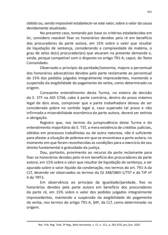 Rev. Trib. Reg. Trab. 3ª Reg., Belo Horizonte, v. 71, n. 111, p. 281-679, jan./jun. 2025501obtido ou, sendo impossível estabelecer-se este valor, sobre o valor da causa devidamente atualizado.No presente caso, tomando por base os critérios estabelecidos em lei, considero razoável fixar os honorários devidos pela ré em benefício dos procuradores da parte autora, em 15% sobre o valor que resultar de liquidação de sentença, considerando a complexidade da matéria, o grau de zelos do(s) procurador(es) que atuaram na presente demanda e, ainda, porque compatível com o disposto no artigo 791-A, caput, do Texto Consolidado.Observado o princípio da paridade/isonomia, majoro o percentual dos honorários advocatícios devidos pela parte reclamante ao percentual de 15% dos pedidos julgados integralmente improcedentes, mantendo a suspensão da exigibilidade do pagamento da verba, como determinado na origem.Consoante entendimento desta Turma, na esteira da decisão do E. STF na ADI 5766, cabe à parte contrária, dentro do prazo máximo legal de dois anos, comprovar que a parte trabalhadora deixou de ser considerada pobre no sentido legal e, caso superado tal prazo e não infirmada a miserabilidade econômica da parte autora, deverá ser extinta a obrigação.Registro que, nos termos da jurisprudência desta Turma e do entendimento majoritário do E. TST, a mera existência de créditos judiciais, obtidos em processos trabalhistas ou de outra natureza, não é suficiente para afastar a situação de pobreza em que se encontrava a parte autora, no momento em que foram reconhecidas as condições para o exercício do seu direito fundamental à gratuidade da justiça.Dou, portanto, provimento ao recurso da parte reclamante para fixar os honorários devidos pela ré em benefício dos procuradores da parte autora, em 15% sobre o valor que resultar de liquidação de sentença, a ser apurado sobre o valor líquido da condenação, nos termos do art. 791-A da CLT, devendo ser observados os termos da OJ 348/SBDI-1/TST e da TJP nº 4 do TRT3.Em observância ao princípio da igualdade/paridade, fixo os honorários devidos pela parte autora em benefício dos procuradores da parte ré, em 15% sobre o valor dos pedidos julgados integralmente improcedentes, mantendo a suspensão da exigibilidade do pagamento da verba, nos termos do artigo 791-A, §4º, da CLT, como determinado na origem.