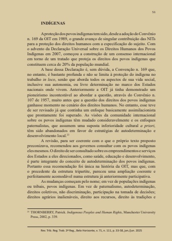 51Rev. Trib. Reg. Trab. 3ª Reg., Belo Horizonte, v. 71, n. 111, p. 33-58, jan./jun. 2025INDÍGENASA proteção dos povos indígenas tem sido, desde a adoção do Convênio n. 169 da OIT em 1989, o grande avanço de singular contribuição das NITs para a proteção dos direitos humanos com a especificação do sujeito. Com o advento da Declaração Universal sobre os Direitos Humanos dos Povos Indígenas em 2007, começou a construção de um consenso internacional em torno de um tratado que proteja os direitos dos povos indígenas que constituem cerca de 20% da população mundial.A base dessa Declaração é, sem dúvida, a Convenção n. 169 que, no entanto, é bastante profunda e não se limita à proteção do indígena no trabalho in loco, senão que aborda todos os aspectos de sua vida social, inclusive sua autonomia, ou livre determinação no marco dos Estados nacionais onde vivem. Anteriormente a OIT já tinha demonstrado um pioneirismo incontestável ao abordar a questão, através do Convênio n. 107 de 1957, muito antes que a questão dos direitos dos povos indígenas ganhasse momento no cenário dos direitos humanos. No entanto, esse teve de ser revisado já que continha um enfoque basicamente assimilacionista que prontamente foi superado. As visões da comunidade internacional sobre os povos indígenas têm mudado consideravelmente e os enfoques paternalistas, que assumem uma suposta inferioridade cultural a priori,têm sido abandonados em favor de estratégias de autodeterminação e desenvolvimento local.23A revisão, para ser coerente com o que o próprio texto proposto preconizava, recomendou aos governos consultar com os povos indígenas eles mesmos. O direito de ser consultado sobre os empreendimentos e serviços dos Estados a eles direcionados, como saúde, educação e desenvolvimento, é parte integrante do conceito de autodeterminação dos povos indígenas. Portanto essa recomendação foi única na história da OIT, mas que, com o precedente da estrutura tripartite, pareceu uma ampliação coerente e perfeitamente acomodável numa estrutura já anteriormente participativa.As mudanças começam pelo nome; em vez de populações indígenas ou tribais, povos indígenas. Em vez de paternalismo, autodeterminação, direitos coletivos, não discriminação, participação na tomada de decisões; direitos agrários inalienáveis, direito aos recursos, direito às tradições e 23 THORNBERRY, Patrick. Indigenous Peoples and Human Rights, Manchester University Press, 2002, p. 339.