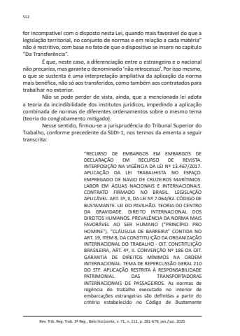 Rev. Trib. Reg. Trab. 3ª Reg., Belo Horizonte, v. 71, n. 111, p. 281-679, jan./jun. 2025512for incompatível com o disposto nesta Lei, quando mais favorável do que a legislação territorial, no conjunto de normas e em relação a cada matéria” não é restritivo, com base no fato de que o dispositivo se insere no capítulo “Da Transferência”.É que, neste caso, a diferenciação entre o estrangeiro e o nacional não precariza, mas garante o denominado ‘não retrocesso’. Por isso mesmo, o que se sustenta é uma interpretação ampliativa da aplicação da norma mais benéfica, não só aos transferidos, como também aos contratados para trabalhar no exterior.Não se pode perder de vista, ainda, que a mencionada lei adota a teoria da incindibilidade dos institutos jurídicos, impedindo a aplicação combinada de normas de diferentes ordenamentos sobre o mesmo tema (teoria do conglobamento mitigado).Nesse sentido, firmou-se a jurisprudência do Tribunal Superior do Trabalho, conforme precedente da SbDI-1, nos termos da ementa a seguir transcrita:“RECURSO DE EMBARGOS EM EMBARGOS DE DECLARAÇÃO EM RECURSO DE REVISTA. INTERPOSIÇÃO NA VIGÊNCIA DA LEI Nº 13.467/2017. APLICAÇÃO DA LEI TRABALHISTA NO ESPAÇO. EMPREGADO DE NAVIO DE CRUZEIROS MARÍTIMOS. LABOR EM ÁGUAS NACIONAIS E INTERNACIONAIS. CONTRATO FIRMADO NO BRASIL. LEGISLAÇÃO APLICÁVEL. ART. 3º, II, DA LEI Nº 7.064/82. CÓDIGO DE BUSTAMANTE. LEI DO PAVILHÃO. TEORIA DO CENTRO DA GRAVIDADE. DIREITO INTERNACIONAL DOS DIREITOS HUMANOS. PREVALÊNCIA DA NORMA MAIS FAVORÁVEL AO SER HUMANO (“PRINCÍPIO PRO HOMINE”). “CLÁUSULA DE BARREIRA” CONTIDA NO ART. 19, ITEM 8, DA CONSTITUIÇÃO DA ORGANIZAÇÃO INTERNACIONAL DO TRABALHO - OIT. CONSTITUIÇÃO BRASILEIRA, ART. 4º, II. CONVENÇÃO Nº 186 DA OIT. GARANTIA DE DIREITOS MÍNIMOS NA ORDEM INTERNACIONAL. TEMA DE REPERCUSSÃO GERAL 210 DO STF. APLICAÇÃO RESTRITA À RESPONSABILIDADE PATRIMONIAL DAS TRANSPORTADORAS INTERNACIONAIS DE PASSAGEIROS. As normas de regência do trabalho executado no interior de embarcações estrangeiras são definidas a partir do critério estabelecido no Código de Bustamante