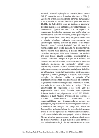 Rev. Trib. Reg. Trab. 3ª Reg., Belo Horizonte, v. 71, n. 111, p. 281-679, jan./jun. 2025515Federal. Quanto à aplicação da Convenção nº 186 da OIT (Convenção sobre Trabalho Marítimo - CTM ), vigente na ordem internacional a partir de 20/08/2013 e incorporada ao direito brasileiro pelo Decreto nº 10.671, de 9/04/2021, que se destina a assegurar direitos iguais a essa categoria de trabalhadores - a denominada “gente do mar” - e se imporia às respectivas legislações nacionais por uniformizar as normas sobre trabalho marítimo, ainda que não possa ser aplicada de forma retroativa, não pode colidir com o citado princípio, indicado expressamente na Constituição Federal, também se choca - e de modo frontal - com a Constituição da OIT ( art. 19, item 8, já mencionado). Com efeito, quando, no direito interno, houver norma mais benéfica, o direito internacional cede-lhe passagem. Não seria diferente, na medida em que busca aquela entidade internacional de direitos humanos assegurar o patamar mínimo de direitos aos trabalhadores, indistintamente, mas em nenhum momento, ao pretender atingir esse desiderato, afasta os sistemas normativos dos diversos países que consagrem preceitos vantajosos. Admitirse tal hipótese revelaria insustentável contrassenso e importaria, ao final, proteção às avessas, por acarretar redução de direitos. Aliás, a própria CTM expressamente destaca essa orientação, ao relembrála (o termo é nela utilizado) no seu Preâmbulo. Ainda, em relação à invocação feita ao artigo 178 da Constituição da República e ao Tema 210 de Repercussão Geral, tese firmada pelo Supremo Tribunal Federal no julgamento do RE 363.331/RJ, segundo a qual haveria prevalência das normas e tratados internacionais limitadores da responsabilidade das transportadoras aéreas de passageiros, especialmente as Convenções de Varsóvia e Montreal, em relação ao Código de Defesa do Consumidor, a simples leitura do precedente invocado afasta a tese de aplicação da mesma ratio decidendi, conforme estabelecido pelo próprio relator, Ministro Gilmar Mendes, porque o caso analisado não tratava de direitos humanos , o que levou à solução com base nos métodos de solução de antinomias entre normas