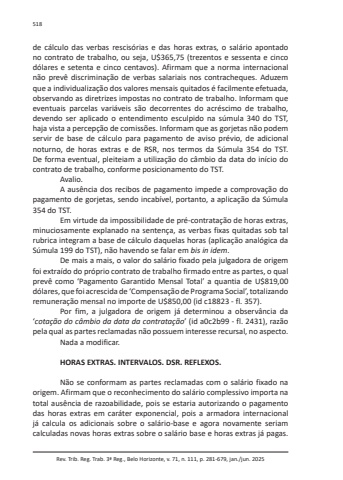 Rev. Trib. Reg. Trab. 3ª Reg., Belo Horizonte, v. 71, n. 111, p. 281-679, jan./jun. 2025518de cálculo das verbas rescisórias e das horas extras, o salário apontado no contrato de trabalho, ou seja, U$365,75 (trezentos e sessenta e cinco dólares e setenta e cinco centavos). Afirmam que a norma internacional não prevê discriminação de verbas salariais nos contracheques. Aduzem que a individualização dos valores mensais quitados é facilmente efetuada, observando as diretrizes impostas no contrato de trabalho. Informam que eventuais parcelas variáveis são decorrentes do acréscimo de trabalho, devendo ser aplicado o entendimento esculpido na súmula 340 do TST, haja vista a percepção de comissões. Informam que as gorjetas não podem servir de base de cálculo para pagamento de aviso prévio, de adicional noturno, de horas extras e de RSR, nos termos da Súmula 354 do TST. De forma eventual, pleiteiam a utilização do câmbio da data do início do contrato de trabalho, conforme posicionamento do TST.Avalio.A ausência dos recibos de pagamento impede a comprovação do pagamento de gorjetas, sendo incabível, portanto, a aplicação da Súmula 354 do TST.Em virtude da impossibilidade de pré-contratação de horas extras, minuciosamente explanado na sentença, as verbas fixas quitadas sob tal rubrica integram a base de cálculo daquelas horas (aplicação analógica da Súmula 199 do TST), não havendo se falar em bis in idem.De mais a mais, o valor do salário fixado pela julgadora de origem foi extraído do próprio contrato de trabalho firmado entre as partes, o qual prevê como ‘Pagamento Garantido Mensal Total’ a quantia de U$819,00 dólares, que foi acrescida de ‘Compensação de Programa Social’, totalizando remuneração mensal no importe de U$850,00 (id c18823 - fl. 357).Por fim, a julgadora de origem já determinou a observância da ‘cotação do câmbio da data da contratação’ (id a0c2b99 - fl. 2431), razão pela qual as partes reclamadas não possuem interesse recursal, no aspecto.Nada a modificar.HORAS EXTRAS. INTERVALOS. DSR. REFLEXOS.Não se conformam as partes reclamadas com o salário fixado na origem. Afirmam que o reconhecimento do salário complessivo importa na total ausência de razoabilidade, pois se estaria autorizando o pagamento das horas extras em caráter exponencial, pois a armadora internacional já calcula os adicionais sobre o salário-base e agora novamente seriam calculadas novas horas extras sobre o salário base e horas extras já pagas.