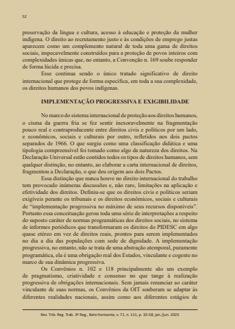 52Rev. Trib. Reg. Trab. 3ª Reg., Belo Horizonte, v. 71, n. 111, p. 33-58, jan./jun. 2025preservação da língua e cultura, acesso à educação e proteção da mulher indígena. O direito ao recrutamento justo e às condições de emprego justas aparecem como um complemento natural de toda uma gama de direitos sociais, impecavelmente construídos para a proteção de povos inteiros com complexidades únicas que, no entanto, a Convenção n. 169 soube responder de forma lúcida e precisa.Esse continua sendo o único tratado significativo de direito internacional que protege de forma específica, em toda a sua complexidade, os direitos humanos dos povos indígenas.IMPLEMENTAÇÃO PROGRESSIVA E EXIGIBILIDADENo marco do sistema internacional de proteção aos direitos humanos, o cisma da guerra fria se fez sentir inexoravelmente na fragmentação pouco real e contraproducente entre direitos civis e políticos por um lado, e econômicos, sociais e culturais por outro, refletidos nos dois pactos separados de 1966. O que surgiu como uma classificação didática e uma tipologia compreensível foi tomado como algo da natureza dos direitos. Na Declaração Universal estão contidos todos os tipos de direitos humanos, sem qualquer distinção, no entanto, ao elaborar a carta internacional de direitos, fragmentou a Declaração, o que deu origem aos dois Pactos.Essa distinção que nunca houve no direito internacional do trabalho tem provocado inúmeras discussões e, não raro, limitações na aplicação e efetividade dos direitos. Definiu-se que os direitos civis e políticos seriam exigíveis perante os tribunais e os direitos econômicos, sociais e culturais de “implementação progressiva no máximo de seus recursos disponíveis”. Portanto essa conceituação gerou toda uma série de interpretações a respeito do suposto caráter de normas programáticas dos direitos sociais, no sistema de informes periódicos que transformaram os direitos do PIDESC em algo quase etéreo em vez de direitos reais, prontos para serem implementados no dia a dia das populações com sede de dignidade. A implementação progressiva, no entanto, não se trata de uma abstração atemporal, puramente programática, ela é uma obrigação real dos Estados, vinculante e cogente no marco de sua dinâmica progressiva.Os Convênios n. 102 e 118 principalmente são um exemplo de pragmatismo, criatividade e consenso no que tange à realização progressiva de obrigações internacionais. Sem jamais renunciar ao caráter vinculante de suas normas, os Convênios da OIT souberam se adaptar às diferentes realidades nacionais, assim como aos diferentes estágios de