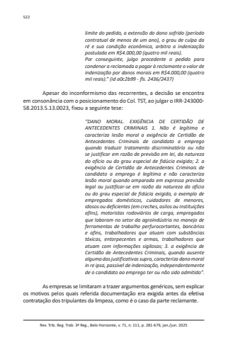 Rev. Trib. Reg. Trab. 3ª Reg., Belo Horizonte, v. 71, n. 111, p. 281-679, jan./jun. 2025522limite do pedido, a extensão do dano sofrido (período contratual de menos de um ano), o grau de culpa da ré e sua condição econômica, arbitro a indenização postulada em R$4.000,00 (quatro mil reais).Por conseguinte, julgo procedente o pedido para condenar a reclamada a pagar à reclamante o valor de indenização por danos morais em R$4.000,00 (quatro mil reais).” (id a0c2b99 - fls. 2436/2437)Apesar do inconformismo das recorrentes, a decisão se encontra em consonância com o posicionamento do Col. TST, ao julgar o IRR-243000-58.2013.5.13.0023, fixou a seguinte tese:“DANO MORAL. EXIGÊNCIA DE CERTIDÃO DE ANTECEDENTES CRIMINAIS 1. Não é legítima e caracteriza lesão moral a exigência de Certidão de Antecedentes Criminais de candidato a emprego quando traduzir tratamento discriminatório ou não se justificar em razão de previsão em lei, da natureza do ofício ou do grau especial de fidúcia exigido; 2. a exigência de Certidão de Antecedentes Criminais de candidato a emprego é legítima e não caracteriza lesão moral quando amparada em expressa previsão legal ou justificar-se em razão da natureza do ofício ou do grau especial de fidúcia exigido, a exemplo de empregados domésticos, cuidadores de menores, idosos ou deficientes (em creches, asilos ou instituições afins), motoristas rodoviários de carga, empregados que laboram no setor da agroindústria no manejo de ferramentas de trabalho perfurocortantes, bancários e afins, trabalhadores que atuam com substâncias tóxicas, entorpecentes e armas, trabalhadores que atuam com informações sigilosas; 3. a exigência de Certidão de Antecedentes Criminais, quando ausente alguma das justificativas supra, caracteriza dano moral in re ipsa, passível de indenização, independentemente de o candidato ao emprego ter ou não sido admitido”.As empresas se limitaram a trazer argumentos genéricos, sem explicar os motivos pelos quais referida documentação era exigida antes da efetiva contratação dos tripulantes da limpeza, como é o caso da parte reclamante.
