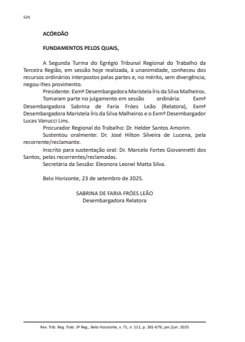Rev. Trib. Reg. Trab. 3ª Reg., Belo Horizonte, v. 71, n. 111, p. 281-679, jan./jun. 2025526ACÓRDÃOFUNDAMENTOS PELOS QUAIS,A Segunda Turma do Egrégio Tribunal Regional do Trabalho da Terceira Região, em sessão hoje realizada, à unanimidade, conheceu dos recursos ordinários interpostos pelas partes e, no mérito, sem divergência, negou-lhes provimento.Presidente: Exmª Desembargadora Maristela Íris da Silva Malheiros.Tomaram parte no julgamento em sessão ordinária: Exmª Desembargadora Sabrina de Faria Fróes Leão (Relatora), Exmª Desembargadora Maristela Íris da Silva Malheiros e o Exmº Desembargador Lucas Vanucci Lins.Procurador Regional do Trabalho: Dr. Helder Santos Amorim.Sustentou oralmente: Dr. José Hilton Silveira de Lucena, pela recorrente/reclamante.Inscrito para sustentação oral: Dr. Marcelo Fortes Giovannetti dos Santos, pelas recorrentes/reclamadas.Secretária da Sessão: Eleonora Leonel Matta Silva.Belo Horizonte, 23 de setembro de 2025.SABRINA DE FARIA FRÓES LEÃODesembargadora Relatora