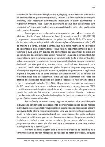 Rev. Trib. Reg. Trab. 3ª Reg., Belo Horizonte, v. 71, n. 111, p. 281-679, jan./jun. 2025529ocorrência “restringem-se a afirmar que, de fato, os empregados prestaram as declarações de que eram agredidos, tinham sua liberdade de locomoção limitada, não recebiam alimentação adequada e eram submetidos a vigilância armada”, que “Não há presunção de que tais declarações são verdadeiras” e que não podem ser responsabilizados pelos atos praticados pelo meeiro Jeconias.Prosseguem os reclamados asseverando que: a) os relatos de Mailson, Paulo Cezar, Jeferson e Roni (transcritos às fls. 1220/1221) comprovam que os trabalhadores cumpriam jornada de 7h às 17h, com 1h de intrajornada, era disponibilizada alimentação suficiente e variada (café de manhã e à tarde, almoço e janta), que não havia restrição na liberdade de locomoção dos trabalhadores (que foram espontaneamente para a fazenda e cujo vício em drogas era alimentado por Jeconias); b) além de as condições dos alojamentos serem “simples” (mas não degradantes), tal circunstância não é suficiente para se concluir pelo ilícito a eles atribuídos, sobretudo porque relatados por procuradora do trabalho e porque conforme declarado por eles próprios, a maioria dos trabalhadores “eram adictos e como tal, sendo eles responsáveis pelas limpezas daqueles alojamentos, não se pode esperar que tudo estivesse perfeito, de forma que a deficiente higiene e limpeza não se pode creditar aos Recorrentes”; c) os relatos de violência física não se sustentam, uma vez que ocorreram em razão da prática de atividades religiosas do colono Jeconias e não teriam ligação com o contrato de trabalho (fl. 1226); d) questões como não fornecimento de EPI, ausência de exames médicos admissionais e de registros na CTPS constituem meras infrações trabalhistas; e) os recorrentes são produtores rurais há mais de 20 anos e contam com conduta ilibada, conforme corroborado pela anexação de declarações de pessoas da comunidade, as quais não foram consideradas.Em razão de todo o exposto, pugnam os reclamados também pela exclusão da condenação ao pagamento de indenizações por danos morais individuais e coletivos (sobretudo porque as referidas condutas não seriam passíveis desta última responsabilização, uma vez que inexistente qualquer lesão a interesses transindividuais) ou sucessivamente, pela redução dos valores arbitrados, por se mostrarem abusivos e desproporcionais à realidade econômica dos ora recorrentes (“pequenos produtores rurais, proprietários dessa terra de não mais que 8 alqueires e que teve última avaliação de R$ 1.500.000,00”).Por fim, os réus alegam que o Ministério Público do Trabalho não tem interesse de agir em relação às obrigações de fazer pleiteadas, as quais