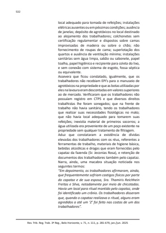 Rev. Trib. Reg. Trab. 3ª Reg., Belo Horizonte, v. 71, n. 111, p. 281-679, jan./jun. 2025532local adequado para tomada de refeições; instalações elétricas ausentes ou em péssimas condições; ausência de janelas; depósito de agrotóxicos no local destinado ao alojamento dos trabalhadores; colchonetes sem certificação regulamentar e dispostos sobre camas improvisadas de madeira ou sobre o chão; não fornecimento de roupas de cama; superlotação dos quartos e ausência de ventilação mínima; instalações sanitárias sem água limpa, sabão ou sabonete, papel toalha, papel higiênico e recipiente para coleta do lixo, e sem conexão com sistema de esgoto, fossa séptica ou equivalente.Assevera que ficou constatado, igualmente, que os trabalhadores não recebiam EPI’s para o manuseio de agrotóxicos na propriedade e que as botas utilizadas por eles na lavoura eram descontadas em valores superiores ao de mercado. Verificaram que os trabalhadores não possuíam registro em CTPS e que diversos direitos trabalhistas lhe foram sonegados; que na frente de trabalho não havia sanitário, tendo os trabalhadores que realizar suas necessidades fisiológicas no mato; que não havia local adequado para tomarem suas refeições; inexistia material de primeiros socorros; a água utilizada era proveniente de um poço existente na propriedade sem qualquer tratamento de filtragem.Aduz que constataram a existência de dívidas elevadas dos trabalhadores com os réus, referentes a ferramentas de trabalho, materiais de higiene básica, bebidas alcoólicas e drogas que eram fornecidas pelo capataz da fazenda (Sr. Jeconias Rosa), e retenção de documentos dos trabalhadores também pelo capataz.Narra, ainda, uma macabra situação noticiada nos seguintes termos:“Em depoimento, os trabalhadores afirmaram, ainda, que frequentemente sofriam castigos físicos por parte do capataz e de sua esposa, Sra. Thamiris Reichhein Freitas e Silva, notadamente por meio de chicotadas. Havia um local para ritual mantido pelo capataz, onde foi identificado um crânio. Os trabalhadores disseram que, quando o capataz realizava o ritual, alguns eram agredidos a até um ‘Z’ foi feito nas costas de um dos trabalhadores”.