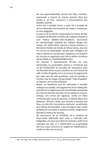 Rev. Trib. Reg. Trab. 3ª Reg., Belo Horizonte, v. 71, n. 111, p. 281-679, jan./jun. 2025534de sua responsabilidade quanto aos fatos narrados, imputando a mesma ao meeiro Jeconias Rosa dos Santos e, ao final, requerem a improcedência dos pedidos autorais.Junto com a petição inicial, o autor fez a juntada de vários elementos documentais de modo a comprovar as suas alegações.Consta no Id. bc7d1c9 a instauração de notícia de fato no âmbito do Ministério Público do Trabalho (Inquérito Civil Público 000007.2023.03.006/4), decorrente de representação realizada por Valdinei Borges dos Santos, em 16/01/2023, perante a Polícia Federal e o Ministério Público do Estado de Minas Gerais, descrita em termo de declarações lavrado pela Delegacia de Polícia Federal em Governador Valadares e em boletim de ocorrência registrado pela Polícia Militar de Minas Gerais (REDS nº. 2023002428835-001).Em resumo, o representante afirmou em suas declarações às autoridades policial e ministerial que no dia 02/04/2022 foi buscado em Vespasiano pelo réu Reinaldo Oliveira para trabalhar em sua lavoura de café no Sítio Chapelão com a promessa de pagamento por cada saco de café apanhado, local de moradia e comida, mas ao chegar à propriedade “Sítio Chapelão” se deparou com outra realidade.Relata, na sequência, que foi submetido à situação análoga a escravidão, sem pagamento, local inadequado para dormir ou higiene pessoal, alimentação consistente em resto de animais silvestres como capivara e macaco, ameaça com armas por jagunços, sendo um deles conhecido pelo nome de Jeconias, e trabalho diário sem descanso. Afirmou, ainda, que durante o período que ficou no sítio três funcionários morreram, acreditando que vítimas de homicídio, e que conseguiu fugir, sendo ajudado por um pastor e, posteriormente, chegando ao Ministério Público de Aimorés.No documento de Id. 337Db18, há o relatório da força-tarefa elaborado pelo autor e instruído com fotografias, em que narra descritivamente a ação fiscal realizada nos dias 17 e 18/01/2023 na propriedade dos réus e que culminou no resgate de trabalhadores, conforme descrito na inicial.