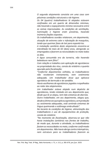 Rev. Trib. Reg. Trab. 3ª Reg., Belo Horizonte, v. 71, n. 111, p. 281-679, jan./jun. 2025536O segundo alojamento consistia em uma casa com péssimas condições estruturais e de higiene.Os 04 (quatro) trabalhadores lá alojados estavam confinados em um quarto de dimensões mínimas, não havendo o espaçamento mínimo necessário entre as camas improvisadas. As condições de ventilação, iluminação e higiene eram precárias, havendo inúmeras fiações expostas.Os trabalhadores ouvidos relataram, em depoimento, situação de extremo calor e infestação de mosquitos, tendo que queimar fezes de boi para espantá-los.A instalação sanitária deste alojamento encontra-se interditada há mais de 02 (dois) anos, obrigando os empregados a fazerem as necessidades no mato todos os dias.A água consumida era da torneira, não havendo bebedouro nem filtro”.Com relação a trabalho com aplicação de agrotóxicos na propriedade dos réus, consta do relatório o quanto apurado pela fiscalização:“Conforme depoimentos colhidos, os trabalhadores não receberam treinamento, nem vestimenta adequada. Um trabalhador disse que aplicava agrotóxico de bermuda e de sandália.Havia vasilhames de agrotóxicos jogados e espalhados ao redor dos alojamentos.Um trabalhador estava alojado num depósito de agrotóxicos, tendo relatado em seu depoimento que, desde que lá se alojou, tem tido sintomas de diarreia.Outro trabalhador, em seu depoimento, alegou que, desde a última vez que aplicou agrotóxico, sem proteção ou vestimenta adequadas, está sentindo sintomas de língua queimando e estômago embrulhado”.No tocante às condições de higiene, alimentação dos trabalhadores e uso de equipamentos de proteção, consta do relatório:“No momento da fiscalização, observou-se que não havia instalações sanitárias nas frentes de trabalho, de modo que, durante a atividade, os trabalhadores faziam as necessidades no mato, conforme confirmado em depoimentos. Não havia abrigo contra intempéries, nem estrutura para os trabalhadores fazerem as
