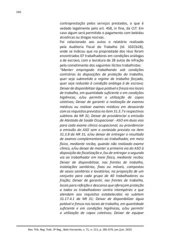Rev. Trib. Reg. Trab. 3ª Reg., Belo Horizonte, v. 71, n. 111, p. 281-679, jan./jun. 2025540contraprestação pelos serviços prestados, o que é vedado legalmente pelo art. 458, in fine, da CLT: Em caso algum será permitido o pagamento com bebidas alcoólicas ou drogas nocivas.Foi colacionado aos autos o relatório realizado pela Auditoria Fiscal do Trabalho (Id. 102Cb28), onde se indicou que na propriedade dos réus foram encontrados 07 trabalhadores em condições análogas a de escravo, com a lavratura de 28 autos de infração pelo cometimento dos seguintes ilícitos trabalhistas:“Manter empregado trabalhando sob condições contrárias às disposições de proteção do trabalho, quer seja submetido a regime de trabalho forçado, quer seja reduzido à condição análoga à de escravo; Deixar de disponibilizar água potável e fresca nos locais de trabalho, em quantidade suficiente e em condições higiênicas, e/ou permitir a utilização de copos coletivos; Deixar de garantir a realização de exames médicos ou realizar exames médicos em desacordo com os requisitos previstos no item 31.3.7 e respectivos subitens da NR 31; Deixar de providenciar a emissão de Atestado de Saúde Ocupacional - ASO em duas vias para cada exame clínico ocupacional, ou providenciar a emissão do ASO sem o conteúdo previsto no item 31.3.8 da NR 31, e/ou deixar de entregar o resultado de exames complementares ao trabalhador, em meio físico, mediante recibo, quando não realizado exame clínico, e/ou deixar de manter a primeira via do ASO à disposição da fiscalização e /ou de entregar a segunda via ao trabalhador em meio físico, mediante recibo; Deixar de disponibilizar, nas frentes de trabalho, instalações sanitárias, fixas ou móveis, compostas de vasos sanitários e lavatórios, na proporção de um conjunto para cada grupo de 40 trabalhadores ou fração; Deixar de garantir, nas frentes de trabalho, locais para refeição e descanso que ofereçam proteção a todos os trabalhadores contra intempéries e que atendam aos requisitos estabelecidos no subitem 31.17.4.1 da NR 31; Deixar de disponibilizar água potável e fresca nos locais de trabalho, em quantidade suficiente e em condições higiênicas, e/ou permitir a utilização de copos coletivos; Deixar de equipar