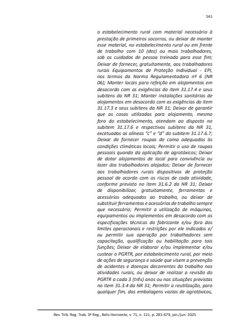 Rev. Trib. Reg. Trab. 3ª Reg., Belo Horizonte, v. 71, n. 111, p. 281-679, jan./jun. 2025541o estabelecimento rural com material necessário à prestação de primeiros socorros, ou deixar de manter esse material, no estabelecimento rural ou em frente de trabalho com 10 (dez) ou mais trabalhadores, sob os cuidados de pessoa treinada para esse fim; Deixar de fornecer, gratuitamente, aos trabalhadores rurais Equipamentos de Proteção Individual - EPI, nos termos da Norma Regulamentadora nº 6 (NR 06); Manter locais para refeição em alojamentos em desacordo com as exigências do item 31.17.4 e seus subitens da NR 31; Manter instalações sanitárias de alojamentos em desacordo com as exigências do item 31.17.3 e seus subitens da NR 31; Deixar de garantir que as casas utilizadas para alojamento, mesmo fora do estabelecimento, atendam ao disposto no subitem 31.17.6 e respectivos subitens da NR 31, excetuadas as alíneas “c” e “d” do subitem 31.17.6.7; Deixar de fornecer roupas de cama adequadas às condições climáticas locais; Permitir o uso de roupas pessoais quando da aplicação de agrotóxicos; Deixar de dotar alojamentos de local para convivência ou lazer dos trabalhadores alojados; Deixar de fornecer aos trabalhadores rurais dispositivos de proteção pessoal de acordo com os riscos de cada atividade, conforme previsto no item 31.6.2 da NR 31; Deixar de disponibilizar, gratuitamente, ferramentas e acessórios adequados ao trabalho, ou deixar de substituir ferramentas e acessórios de trabalho sempre que necessário; Permitir a utilização de máquinas, equipamentos ou implementos em desacordo com as especificações técnicas do fabricante e/ou fora dos limites operacionais e restrições por ele indicados e/ou permitir sua operação por trabalhadores sem capacitação, qualificação ou habilitação para tais funções; Deixar de elaborar e/ou implementar e/ou custear o PGRTR, por estabelecimento rural, por meio de ações de segurança e saúde que visem a prevenção de acidentes e doenças decorrentes do trabalho nas atividades rurais, ou deixar de realizar a revisão do PGRTR a cada 3 (três) anos ou nas situações previstas no item 31.3.4 da NR 31; Permitir a reutilização, para qualquer fim, das embalagens vazias de agrotóxicos,