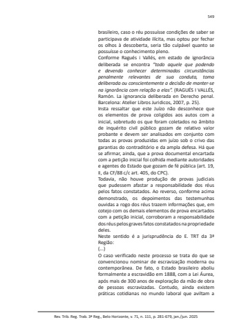 Rev. Trib. Reg. Trab. 3ª Reg., Belo Horizonte, v. 71, n. 111, p. 281-679, jan./jun. 2025549brasileiro, caso o réu possuísse condições de saber se participava de atividade ilícita, mas optou por fechar os olhos à descoberta, seria tão culpável quanto se possuísse o conhecimento pleno.Conforme Ragués i Vallés, em estado de ignorância deliberada se encontra “todo aquele que podendo e devendo conhecer determinadas circunstâncias penalmente relevantes de sua conduta, toma deliberada ou conscientemente a decisão de manter-se na ignorância com relação a elas”. (RAGUÉS I VALLÉS, Ramón. La ignorancia deliberada en Derecho penal. Barcelona: Atelier Libros Juridicos, 2007, p. 25).Insta ressaltar que este Juízo não desconhece que os elementos de prova coligidos aos autos com a inicial, sobretudo os que foram coletados no âmbito de inquérito civil público gozam de relativo valor probante e devem ser analisados em conjunto com todas as provas produzidas em juízo sob o crivo das garantias do contraditório e da ampla defesa. Há que se afirmar, ainda, que a prova documental encartada com a petição inicial foi colhida mediante autoridades e agentes do Estado que gozam de fé pública (art. 19, II, da CF/88 c/c art. 405, do CPC).Todavia, não houve produção de provas judiciais que pudessem afastar a responsabilidade dos réus pelos fatos constatados. Ao reverso, conforme acima demonstrado, os depoimentos das testemunhas ouvidas a rogo dos réus trazem informações que, em cotejo com os demais elementos de prova encartados com a petição inicial, corroboram a responsabilidade dos réus pelos graves fatos constatados na propriedade deles.Neste sentido é a jurisprudência do E. TRT da 3ª Região:(...)O caso verificado neste processo se trata do que se convencionou nominar de escravização moderna ou contemporânea. De fato, o Estado brasileiro aboliu formalmente a escravidão em 1888, com a Lei Áurea, após mais de 300 anos de exploração da mão de obra de pessoas escravizadas. Contudo, ainda existem práticas cotidianas no mundo laboral que aviltam a