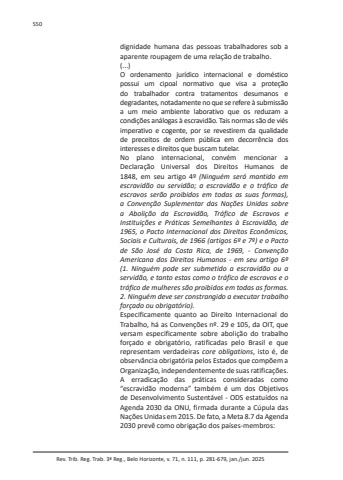 Rev. Trib. Reg. Trab. 3ª Reg., Belo Horizonte, v. 71, n. 111, p. 281-679, jan./jun. 2025550dignidade humana das pessoas trabalhadores sob a aparente roupagem de uma relação de trabalho.(...)O ordenamento jurídico internacional e doméstico possui um cipoal normativo que visa a proteção do trabalhador contra tratamentos desumanos e degradantes, notadamente no que se refere à submissão a um meio ambiente laborativo que os reduzam a condições análogas à escravidão. Tais normas são de viés imperativo e cogente, por se revestirem da qualidade de preceitos de ordem pública em decorrência dos interesses e direitos que buscam tutelar.No plano internacional, convém mencionar a Declaração Universal dos Direitos Humanos de 1848, em seu artigo 4º (Ninguém será mantido em escravidão ou servidão; a escravidão e o tráfico de escravos serão proibidos em todas as suas formas), a Convenção Suplementar das Nações Unidas sobre a Abolição da Escravidão, Tráfico de Escravos e Instituições e Práticas Semelhantes à Escravidão, de 1965, o Pacto Internacional dos Direitos Econômicos, Sociais e Culturais, de 1966 (artigos 6º e 7º) e o Pacto de São José da Costa Rica, de 1969, - Convenção Americana dos Direitos Humanos - em seu artigo 6º (1. Ninguém pode ser submetido a escravidão ou a servidão, e tanto estas como o tráfico de escravos e o tráfico de mulheres são proibidos em todas as formas. 2. Ninguém deve ser constrangido a executar trabalho forçado ou obrigatório).Especificamente quanto ao Direito Internacional do Trabalho, há as Convenções nº. 29 e 105, da OIT, que versam especificamente sobre abolição do trabalho forçado e obrigatório, ratificadas pelo Brasil e que representam verdadeiras core obligations, isto é, de observância obrigatória pelos Estados que compõem a Organização, independentemente de suas ratificações.A erradicação das práticas consideradas como “escravidão moderna” também é um dos Objetivos de Desenvolvimento Sustentável - ODS estatuídos na Agenda 2030 da ONU, firmada durante a Cúpula das Nações Unidas em 2015. De fato, a Meta 8.7 da Agenda 2030 prevê como obrigação dos países-membros: