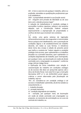 Rev. Trib. Reg. Trab. 3ª Reg., Belo Horizonte, v. 71, n. 111, p. 281-679, jan./jun. 2025552XIII - é livre o exercício de qualquer trabalho, ofício ou profissão, atendidas as qualificações profissionais que a lei estabelecer;XXIII - a propriedade atenderá a sua função social;LIV - ninguém será privado da liberdade ou de seus bens sem o devido processo legal;”A redução de trabalhadores à condição análoga à escravidão é prática repulsiva, nefasta e de tamanha abjeção, que a Constituição Federal estipula expressamente a expropriação de propriedades e confisco de bens que envolvam tais condutas.(...)Há, ainda, uma gama extensa de legislação infraconstitucional que visa resguardar a incolumidade física e psíquica de trabalhadores, com a promoção de condições dignas e de estabelecimento de trabalho decente, em todas as suas formas. A relevância deste tema deu ensejo à edição de preceito penal que tipifica a conduta de “reduzir alguém a condição análoga à de escravo, quer submetendo-o a trabalhos forçados ou a jornada exaustiva, quer sujeitando-o a condições degradantes de trabalho, quer restringindo, por qualquer meio, sua locomoção em razão de dívida contraída com o empregador ou preposto”, conforme artigo 149 do Código Penal.A tipificação do ilícito trabalhista com relação à caracterização do trabalho em condições análogas ao de escravo não deve ser perquirida apenas sob a ótica do Direito Penal. Com este fim é que a Instrução Normativa MTP n.º 2, de 22/01/2021 prevê alguns critérios a serem observados pela fiscalização do trabalho, veja-se:“Art. 23. Considera-se em condição análoga à de escravo o trabalhador submetido, de forma isolada ou conjuntamente, a:I - trabalho forçado;II - jornada exaustiva;III - condição degradante de trabalho;IV - restrição, por qualquer meio, de locomoção em razão de dívida contraída com empregador ou preposto, no momento da contratação ou no curso do contrato de trabalho; ou